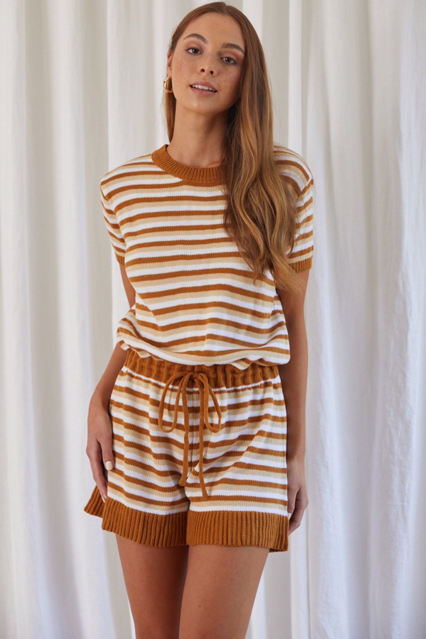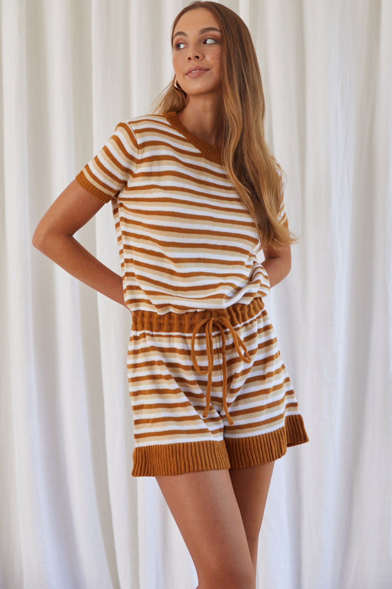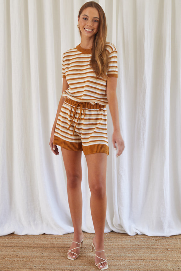 Johana Drawstring Romper Striped Camel