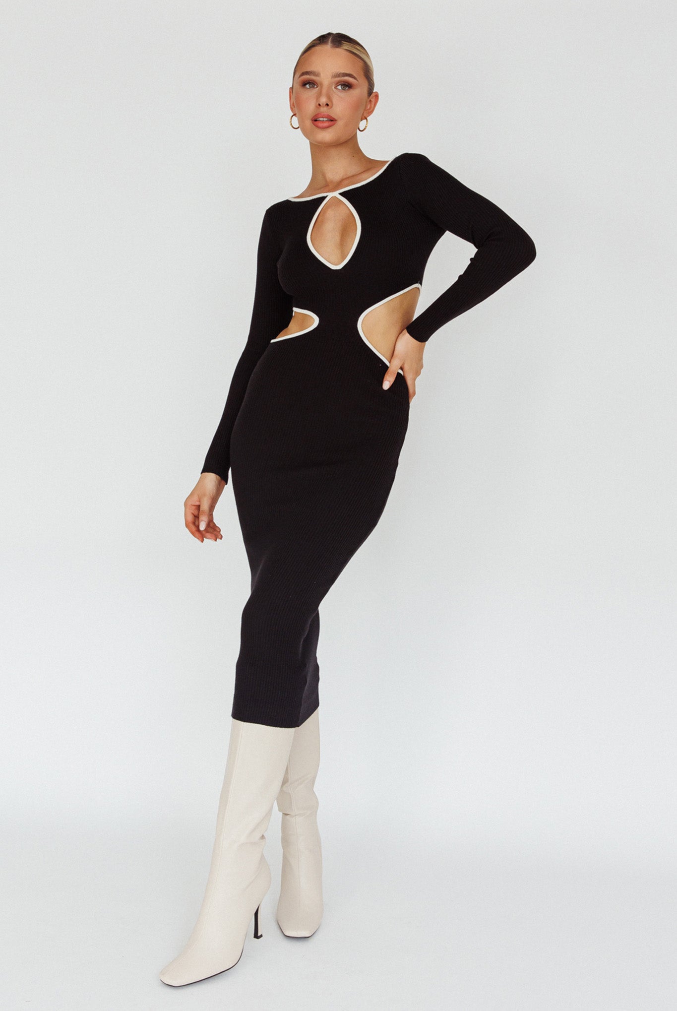 Steal the spotlight in our super cute Jovie midi dress. Featuring hot keyhole details and a soft, ribbed knit fabric. It's perfect for dinner dates with your besties teamed with boots and a statement purse.