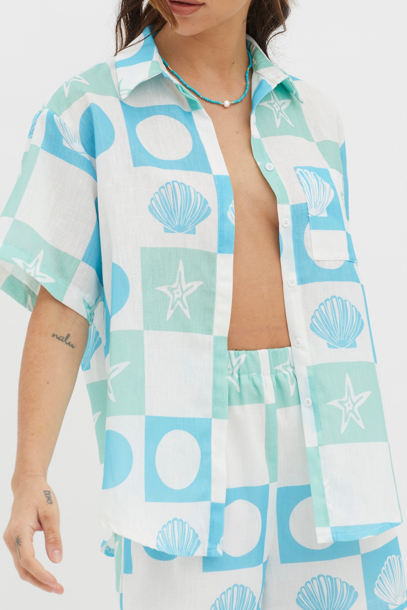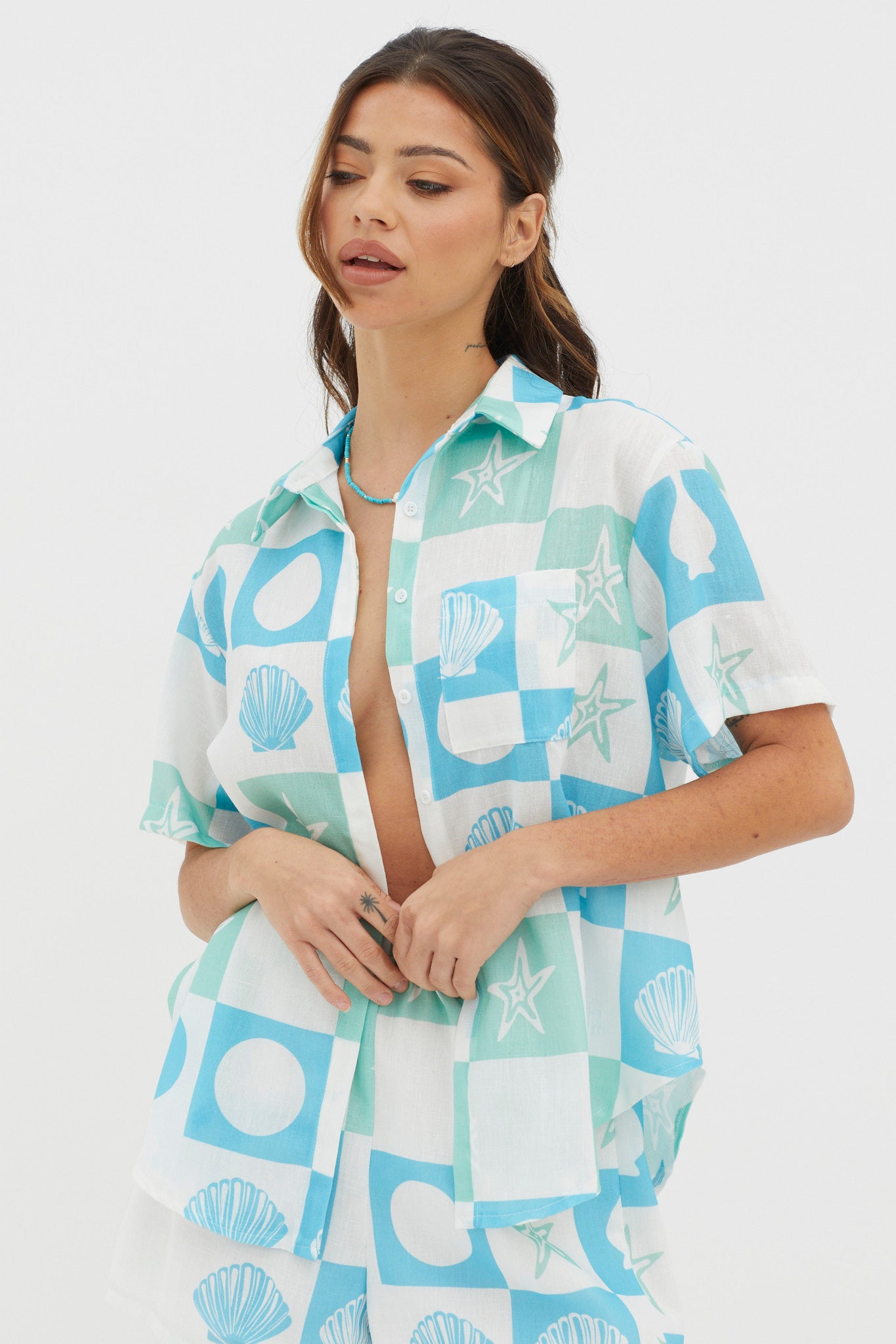 Hey there, cutie! We are loving the print on our Just A Hunch shirt. Perfect for weekend brunch dates with your besties, it looks super cute paired with its matching shorts or wear it with a denim mini and mules for a look we are loving.