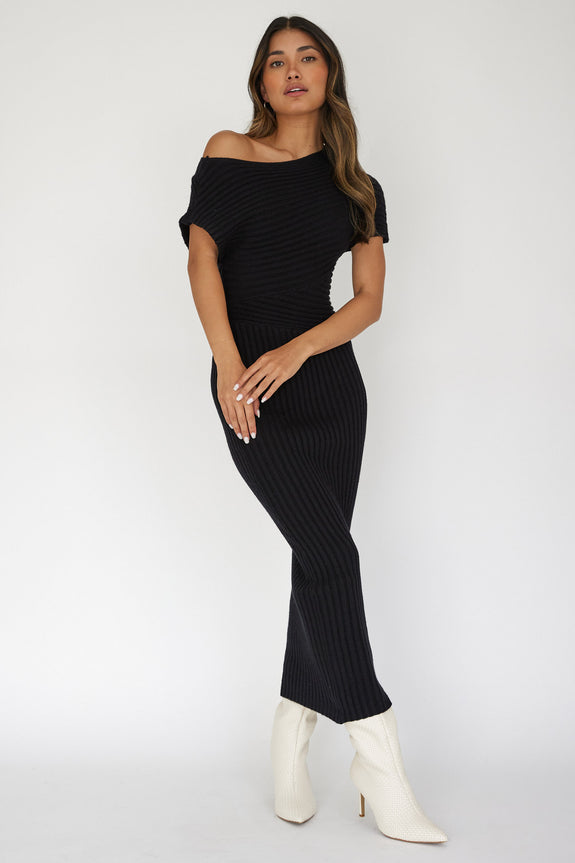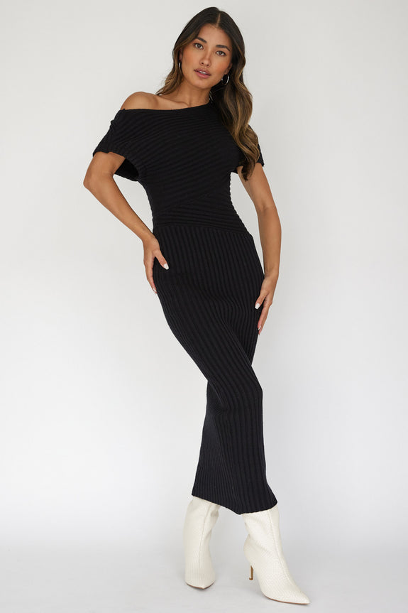Kaelyn Asymmetric Neck Knit Maxi Dress Black