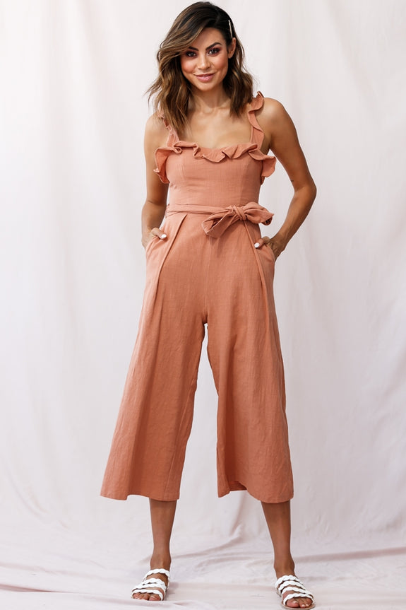 Every wardrobe needs a jumpsuit you can throw on without too much thought and still look super cute and chic. Our Kaia jumpsuit is your answer. Featuring a frill trimmed bust, ruffle straps, wide leg, on-trend capri length and separate waist belt. Perfect for a daytime BBQ with your friends, teamed with some simple canvas wedges or dress it down with some strappy sandals and a basket bag.
