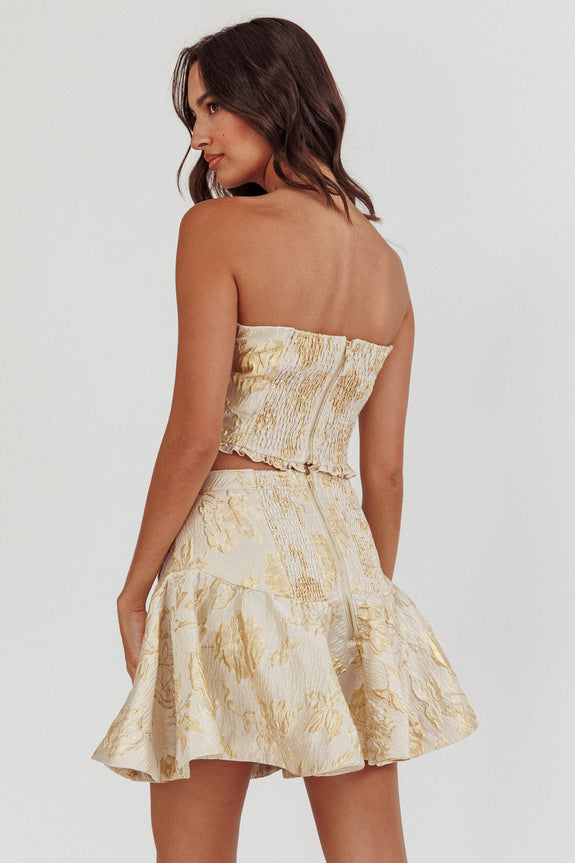 Make your grand entrance in our Kamilla skirt. It features a flared design and stunning jacquard fabric. It's begging to be worn for your next glam event teamed with its matching top and strappy, tie-up heels for a look we are loving.
