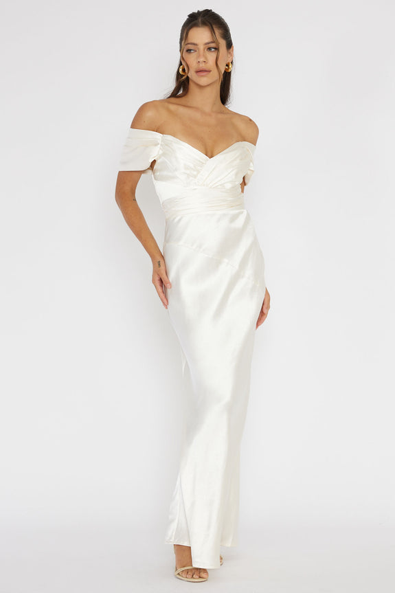 Make your grand entrance in our stunning Katrina maxi dress. It features a satin fabric and a flattering, off-shoulder design. It's perfect for a wedding or special occasion! Team it with nude heels, statement earrings, and a clutch for a jaw-dropping look.