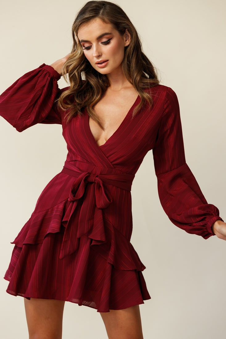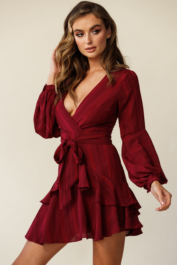 Holiday party? Meeting the in-laws? This gorgeous dress has you covered. Partially lined, with its on-trend ruffle detail in the skirt, long balloon sleeves and flattering, faux-wrap neckline, you'll be turning heads every where you go. Pair it with single strap nude heels for a look we are loving.