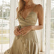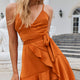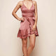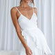 Thin strapped sweetheart fitted cross over dress with frilly trim.