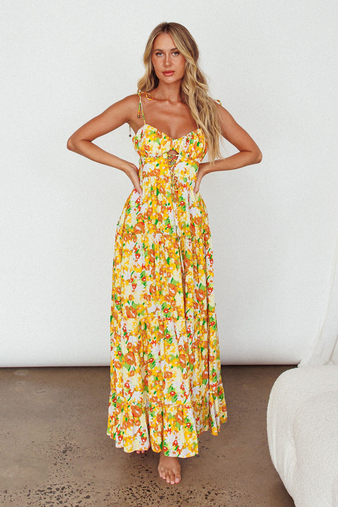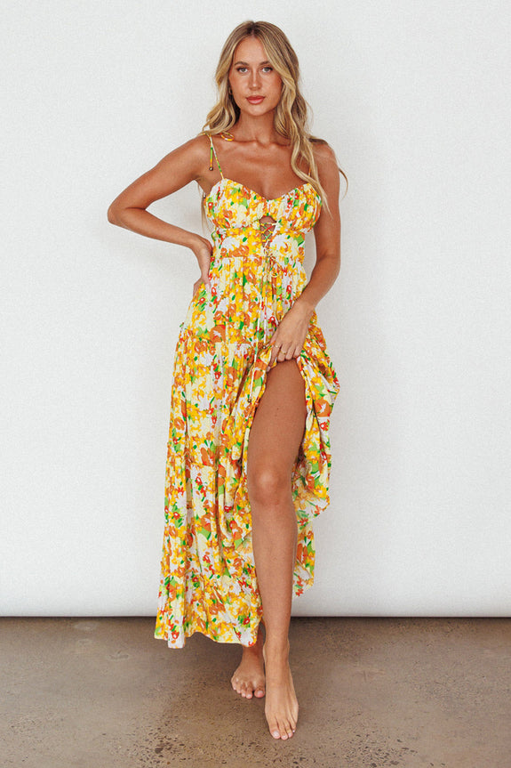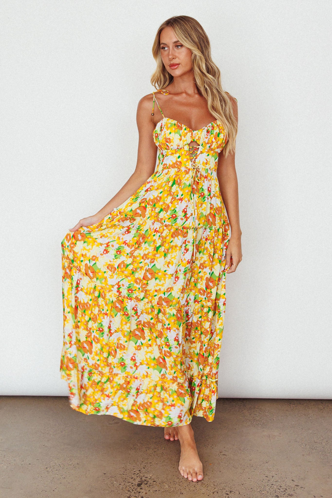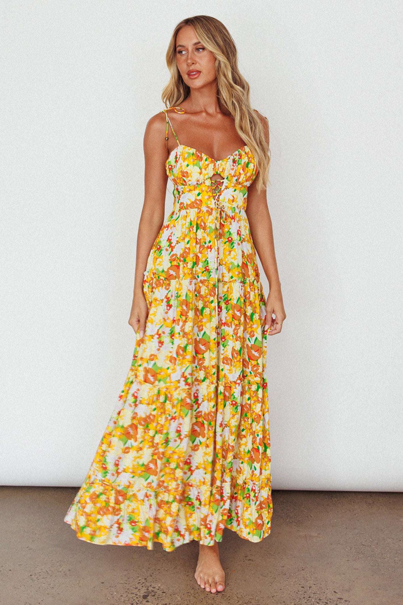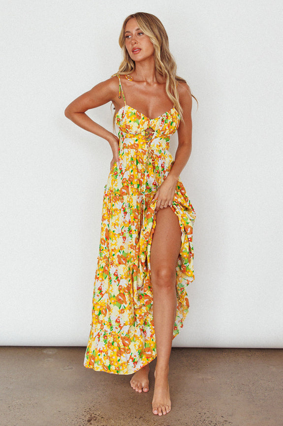 Turn heads in our beautiful Kinlee maxi dress. Featuring lace-up detail in the bodice and tied shoulders. It's perfect for sunny weekends strolling your fave vintage markets. Team it with tan sandals and a tote for a dreamy look we are loving.
