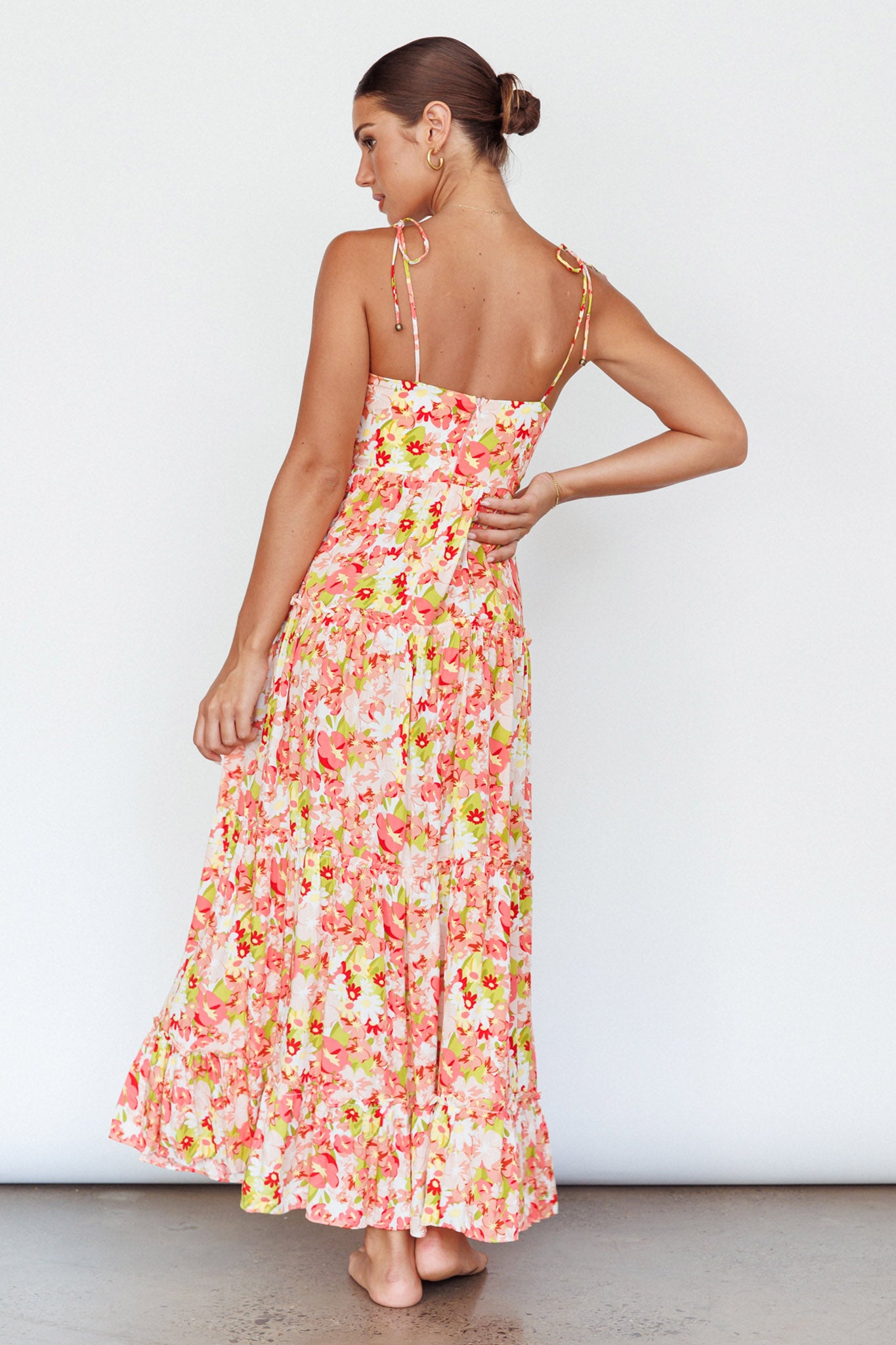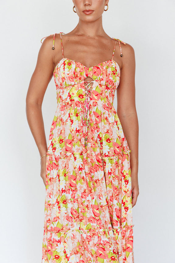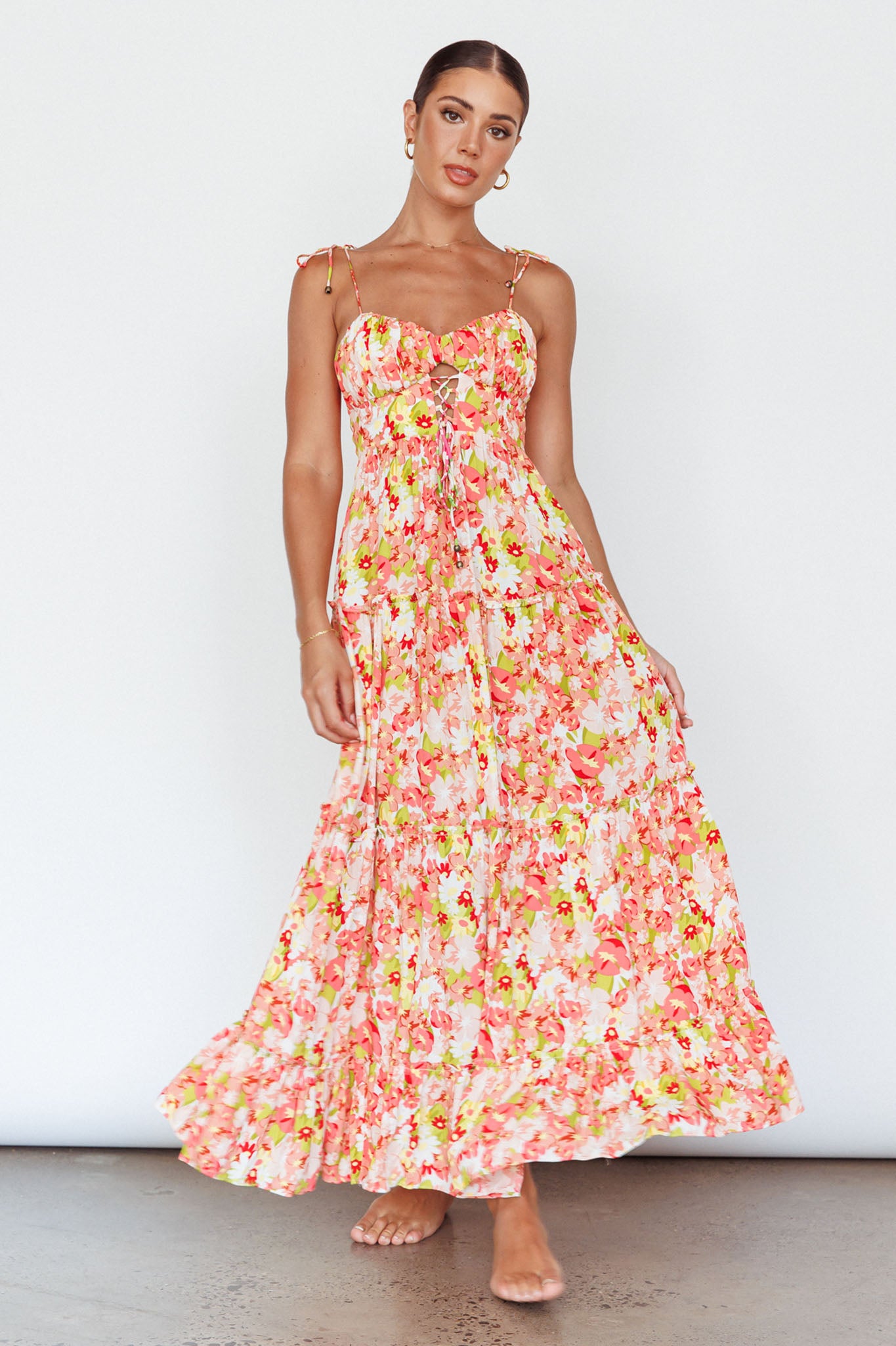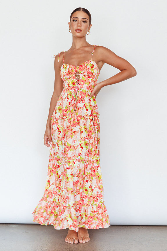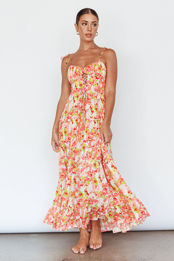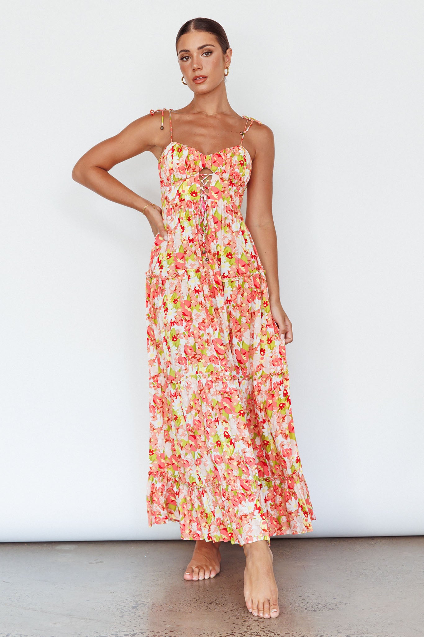 Turn heads in our beautiful Kinlee maxi dress. Featuring lace-up detail in the bodice and tied shoulders. It's perfect for sunny weekends strolling your fave vintage markets. Team it with tan sandals and a tote for a dreamy look we are loving.