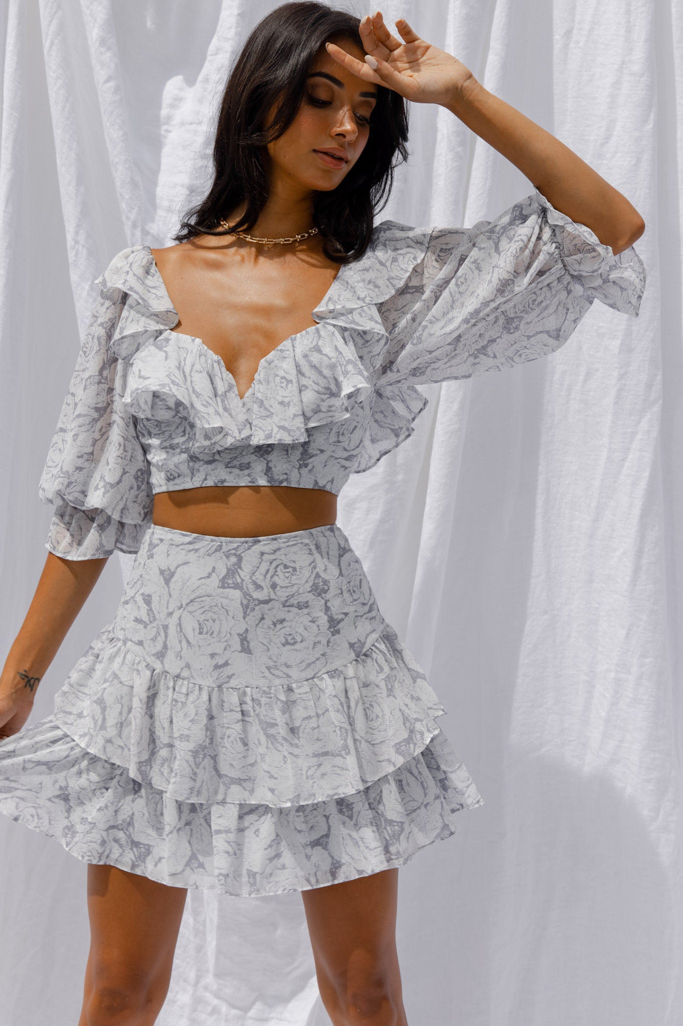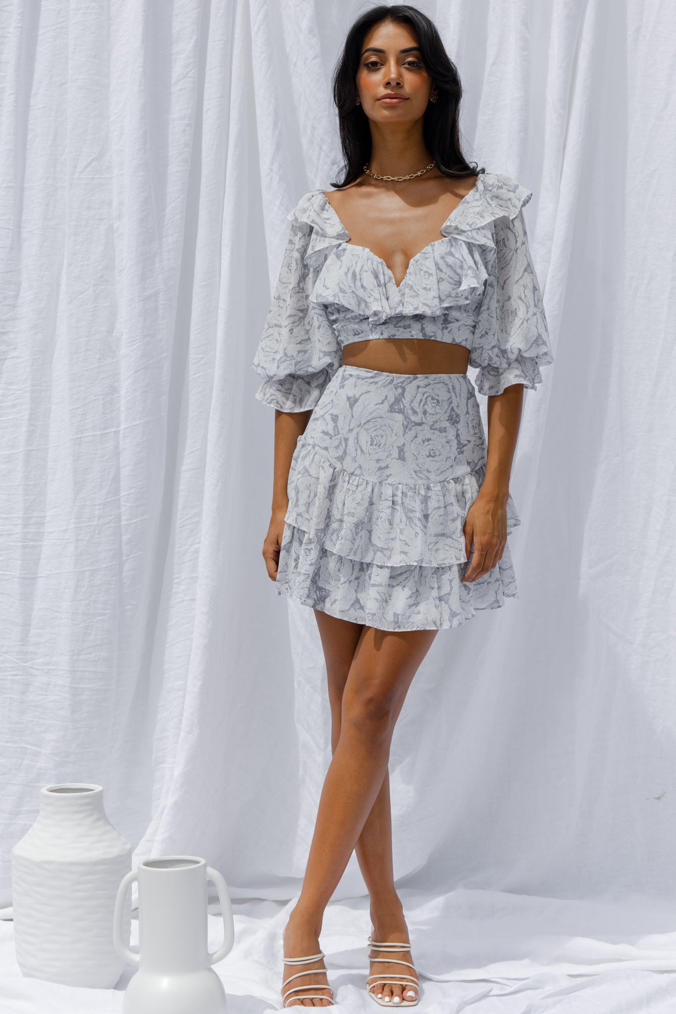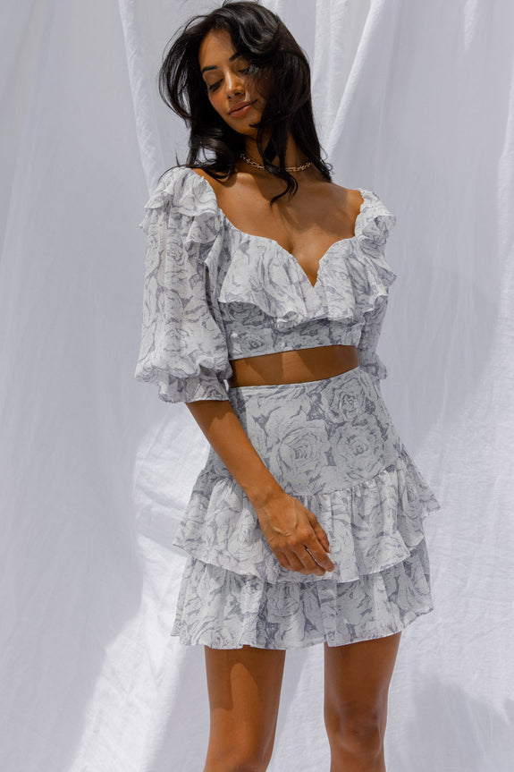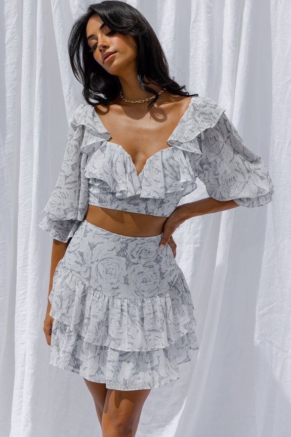 Get ready to be flooded with compliments in our super cute Kiss And Tell skirt. We are loving the pretty chiffon fabric and double layer flounce hem. Perfect for Sunday Brunch with your girls teamed with its matching crop top and kitten heels.