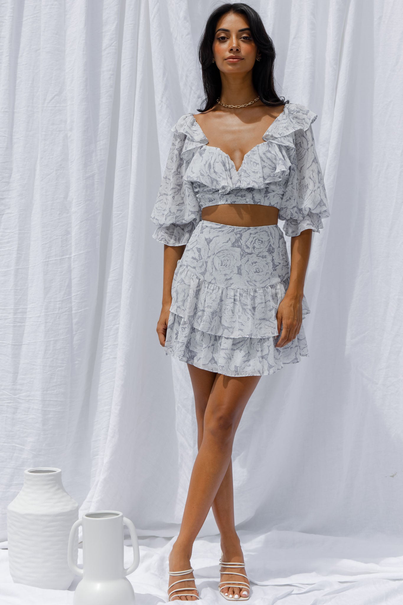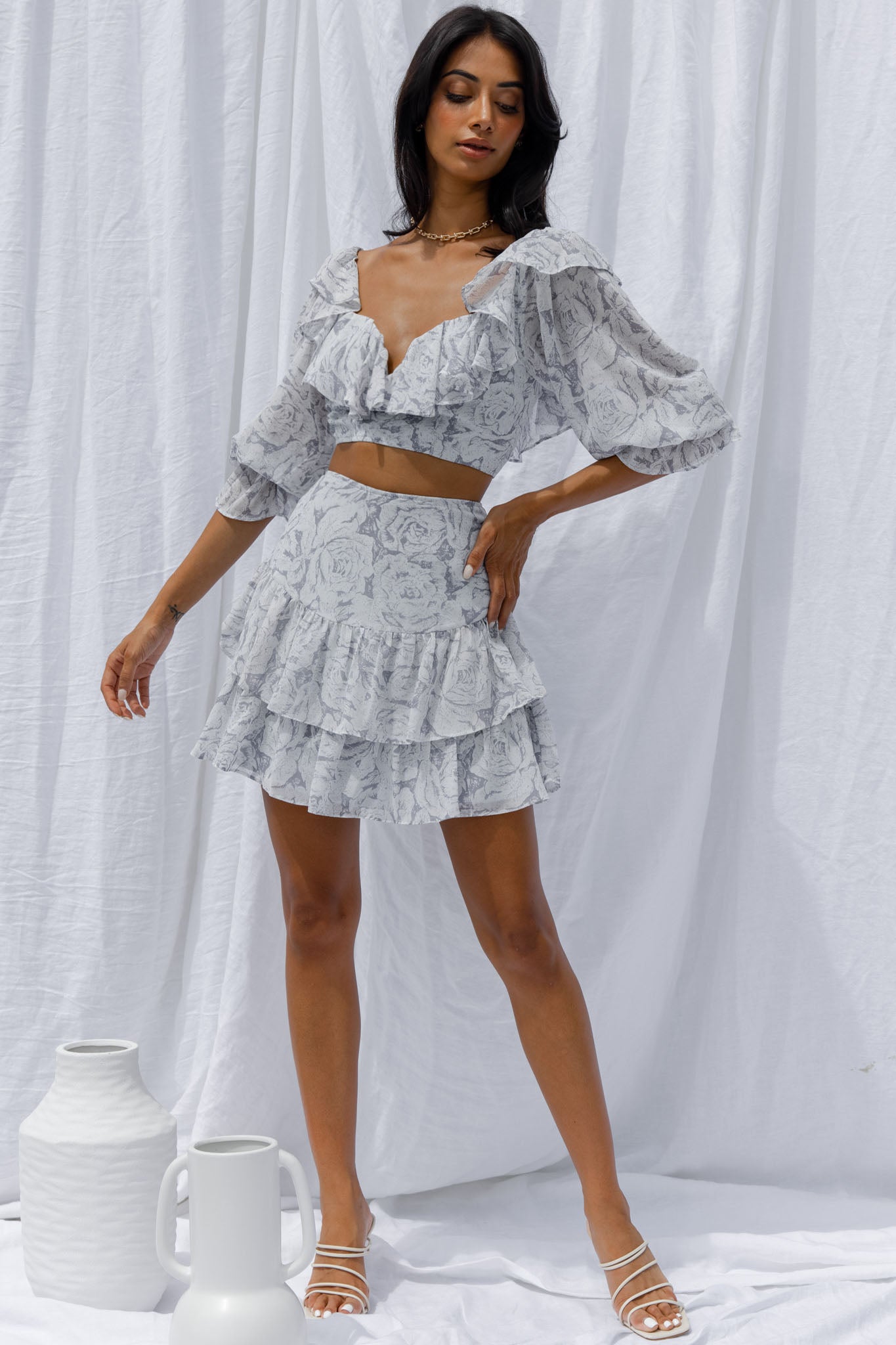 Get ready to be flooded with compliments in our super cute Kiss And Tell skirt. We are loving the pretty chiffon fabric and double layer flounce hem. Perfect for Sunday Brunch with your girls teamed with its matching crop top and kitten heels.