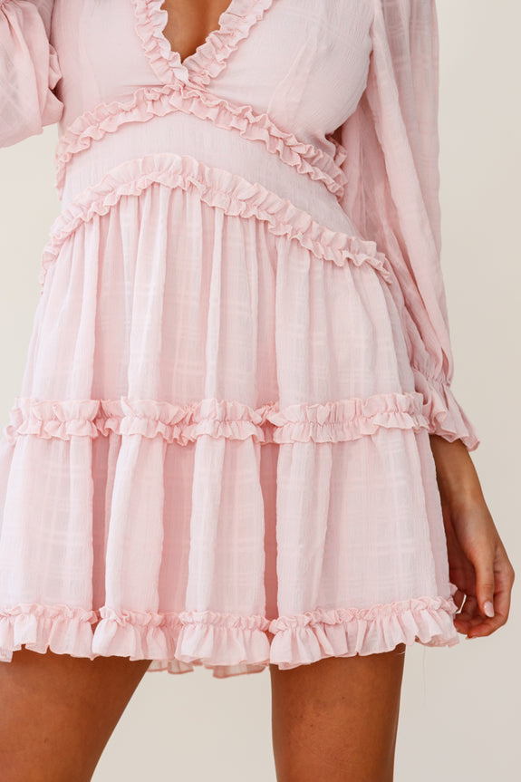 Laney. She's ALL that. And you will be too in this super cute dress featuring three-quarter balloon sleeves, a delicate ruffle trim around the skirt, torso and neckline and our favorite part: the most adorable cutout back feature trimmed with the same pretty ruffle detail echoed throughout the dress. The fabric is soft and floaty and there's a lining under the skirt and bust for modesty. Wear it on a girl's night out with strappy nude heels or ankle boots for a look we are loving.