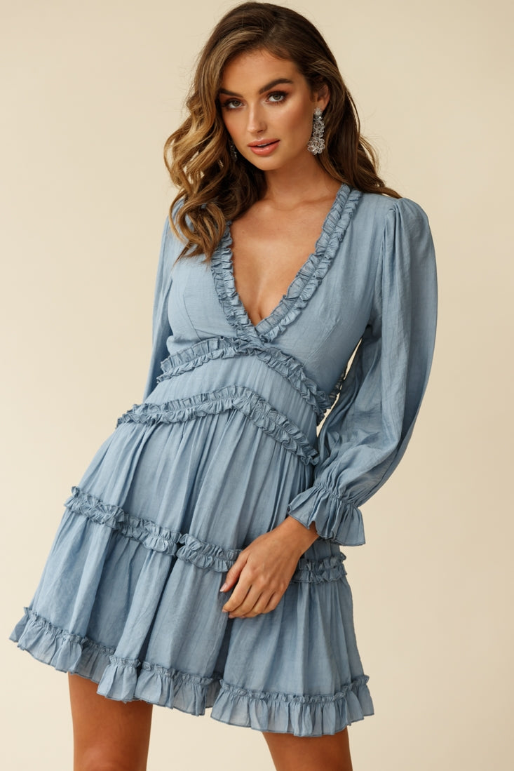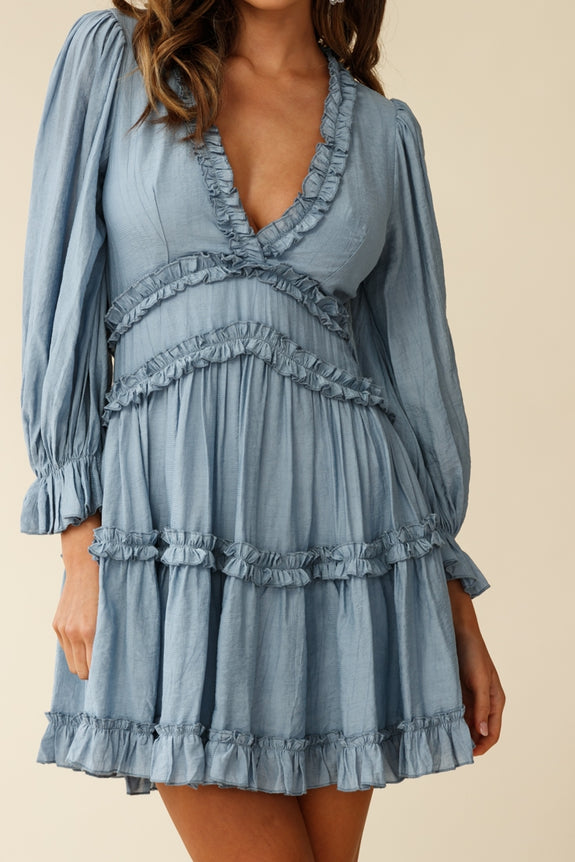 Laney. She's ALL that. And you will be too in this super cute dress featuring seven-eighth balloon sleeves, a delicate ruffle trim around the skirt, torso and neckline and our favorite part: the most adorable cutout back feature trimmed with the same pretty ruffle detail echoed throughout the dress. Wear it on a girl's night out with strappy nude heels or ankle boots for a look we are loving.