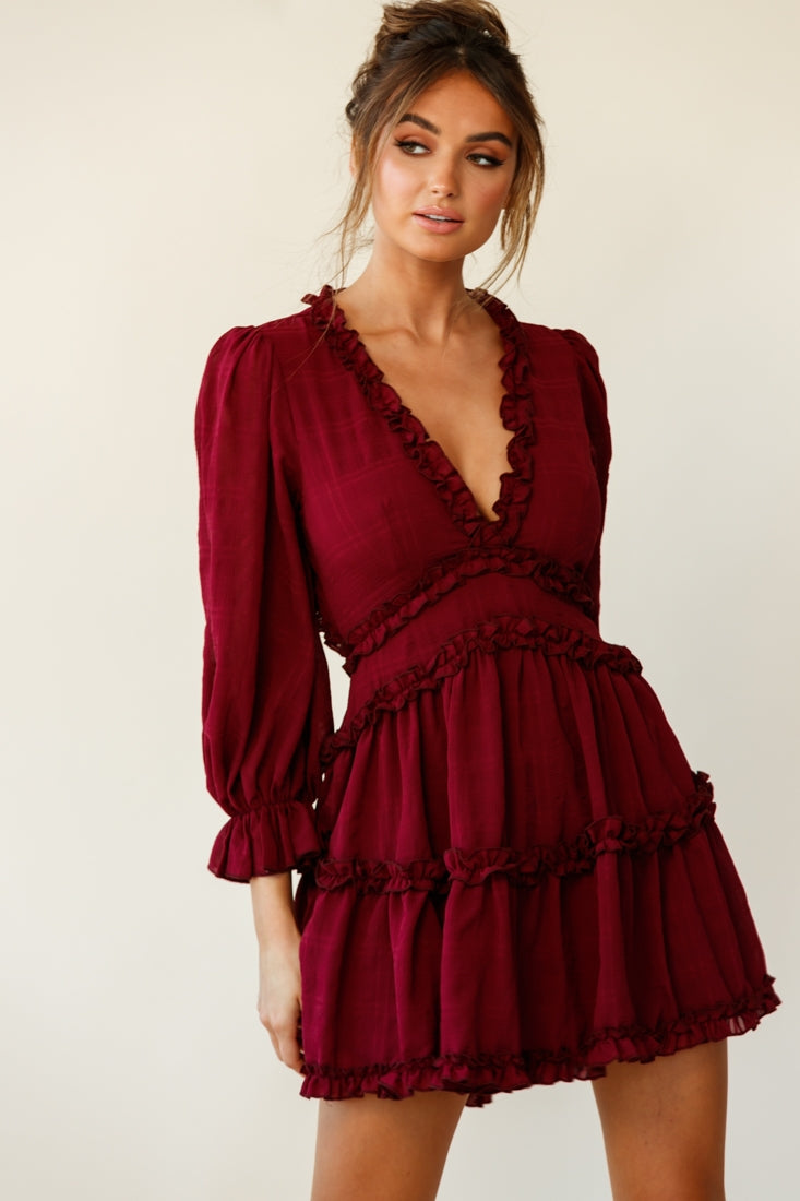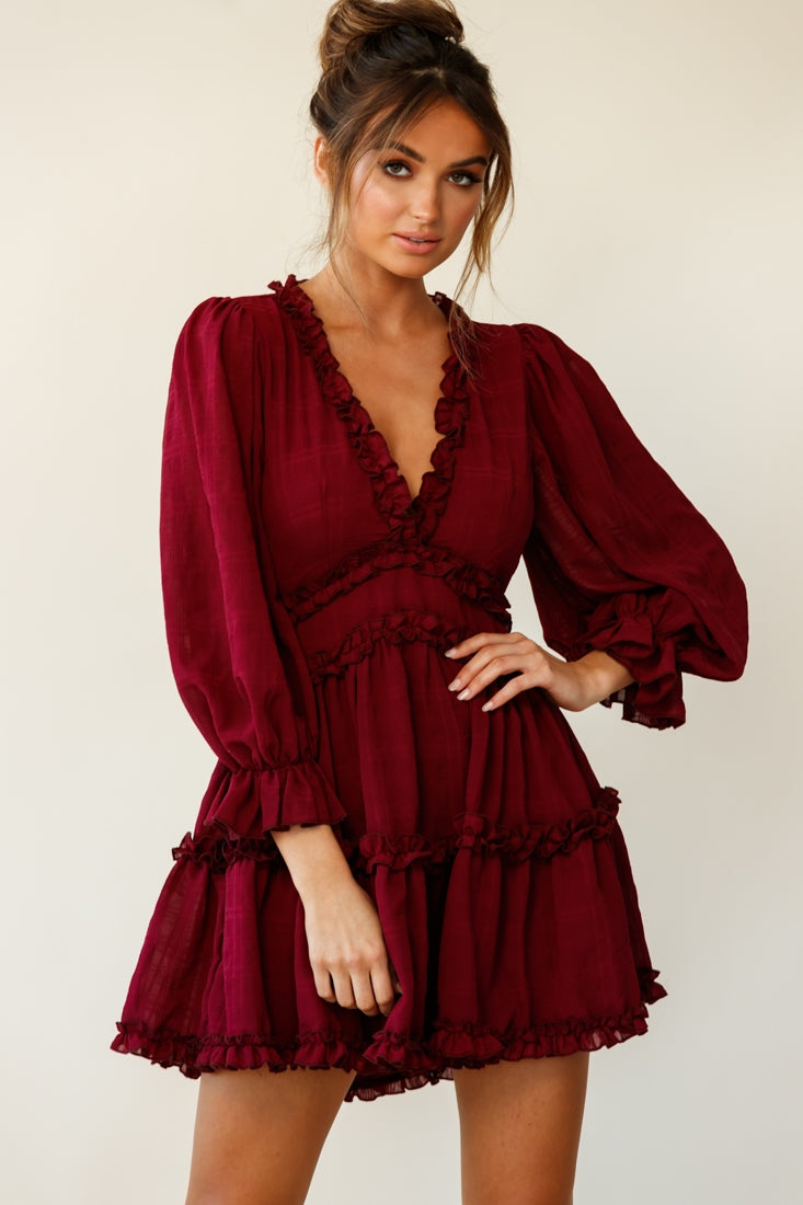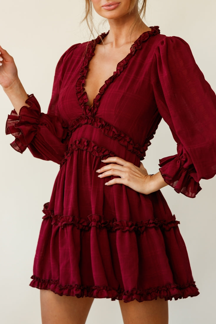 Laney. She's ALL that. And you will be too in this super cute dress featuring ruffle-cuffed lantern sleeves, a delicate ruffle trim around the skirt, torso and neckline and our favorite part: the most adorable cutout back feature trimmed with the same pretty ruffle detail echoed throughout the dress. There's a lining under the skirt and bust for modesty. Wear it on a girl's night out with strappy statement heels or boots for a look we are loving.