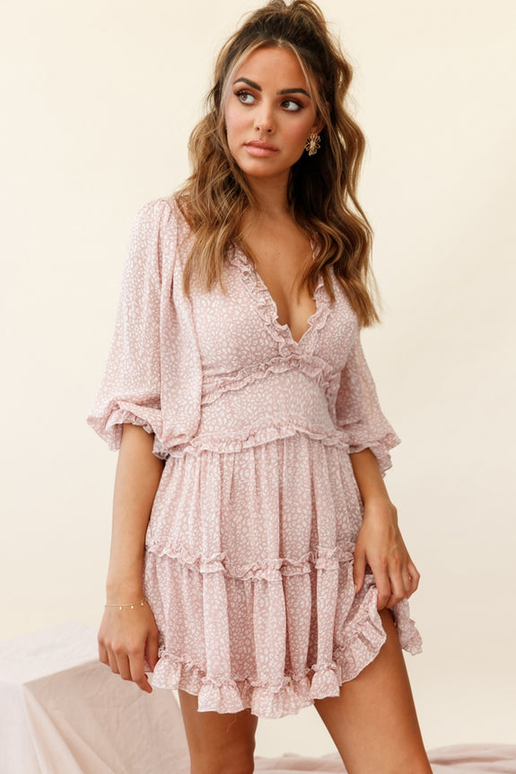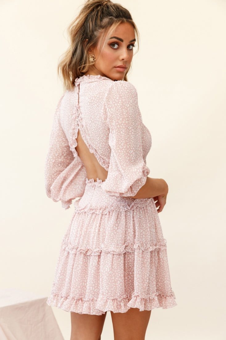 Laney. She's ALL that. And you will be too in this super cute dress featuring three-quarter balloon sleeves, a delicate ruffle trim around the skirt, torso and neckline and our favorite part: the most adorable cutout back feature trimmed with the same pretty ruffle detail echoed throughout the dress. The sheer chiffon is soft and floaty and there's a lining under the skirt and bust for modesty. Wear it on a girl's night out with strappy nude heels or ankle boots for a look we are loving.