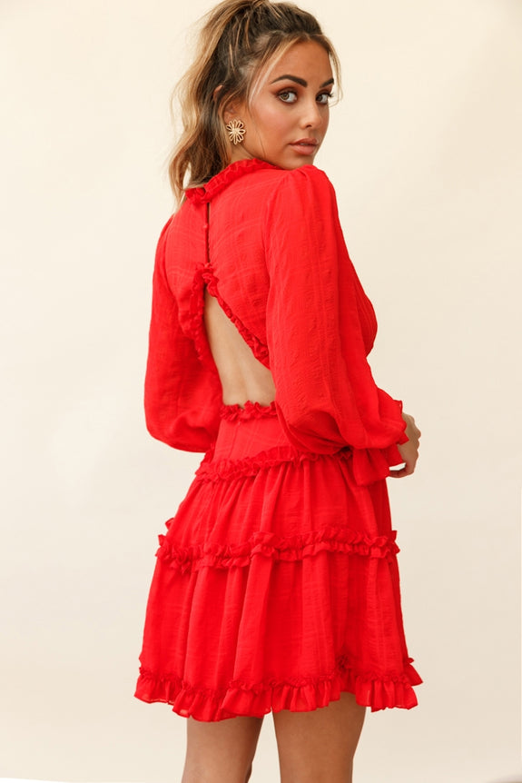 Laney. She's ALL that. And you will be too in this super cute dress featuring ruffle-cuffed lantern sleeves, a delicate ruffle trim around the skirt, torso and neckline and our favorite part: the most adorable cutout back feature trimmed with the same pretty ruffle detail echoed throughout the dress. The sheer chiffon is soft and floaty and there's a lining under the skirt and bust for modesty. Wear it on a girl's night out with strappy nude heels or ankle boots for a look we are loving.