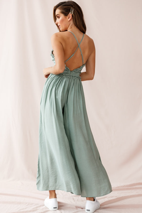 Laney. She's ALL that. And you will be too in this super cute jumpsuit featuring adjustable shoulder straps, a delicate ruffle trim around the V-neckline and torso and breezy wide-leg style. Wear it on a girls' night out with strappy nude heels or during the day to a BBQ pool party teamed with canvas wedges.