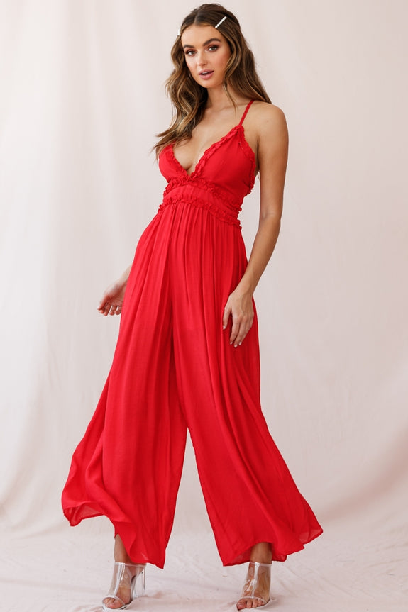 Laney. She's ALL that. And you will be too in this super cute jumpsuit featuring adjustable shoulder straps, a delicate ruffle trim around the V-neckline and torso and breezy wide-leg style. Wear it on a girls' night out with strappy nude heels or during the day to a BBQ pool party teamed with canvas wedges.