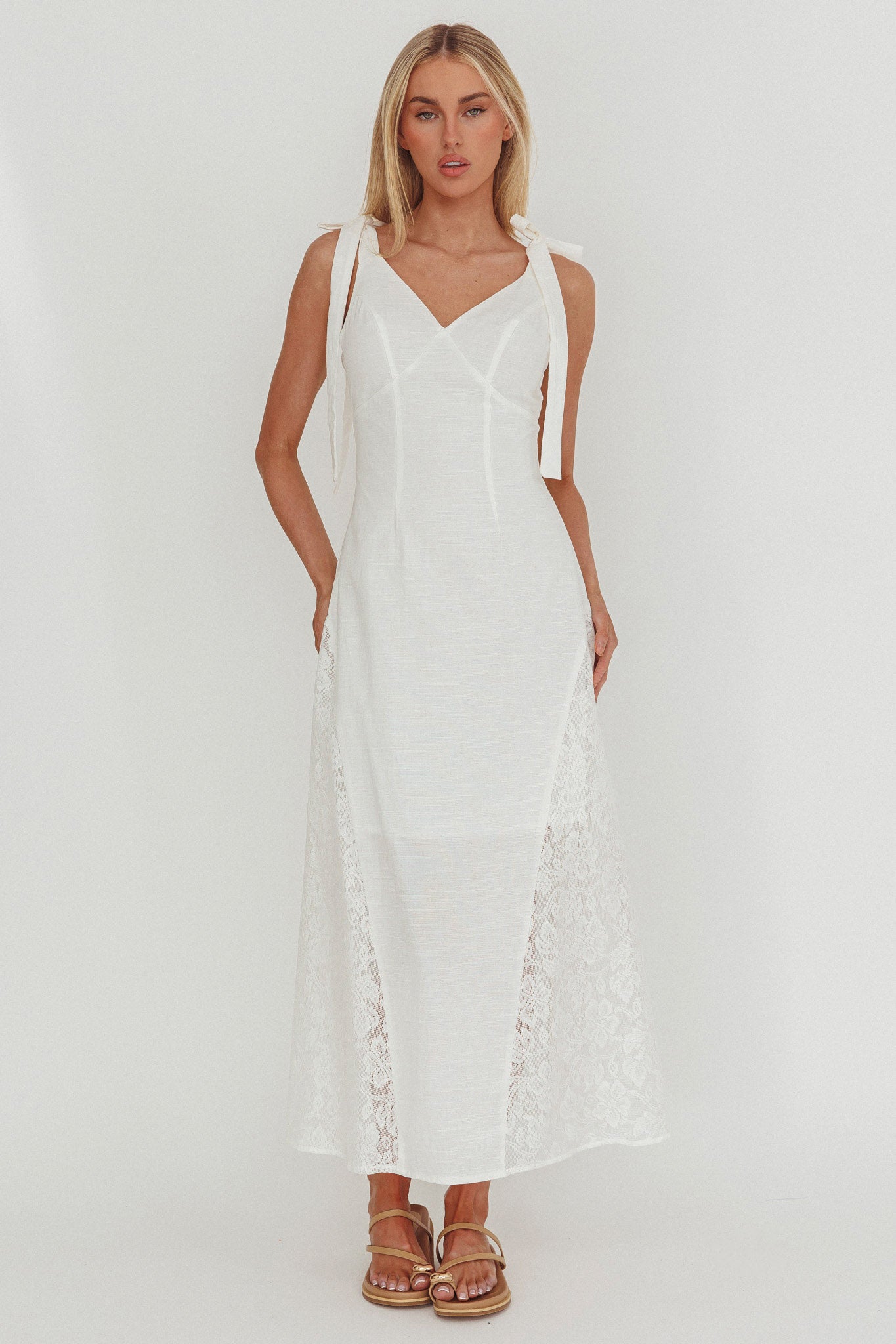 You will feel like a princess in our gorgeous Lead Me On maxi dress. It features pretty tied shoulders and romantic lace panels in the skirt. It's perfect for lunch dates with your lover teamed with mules and a tote for a look we are loving.