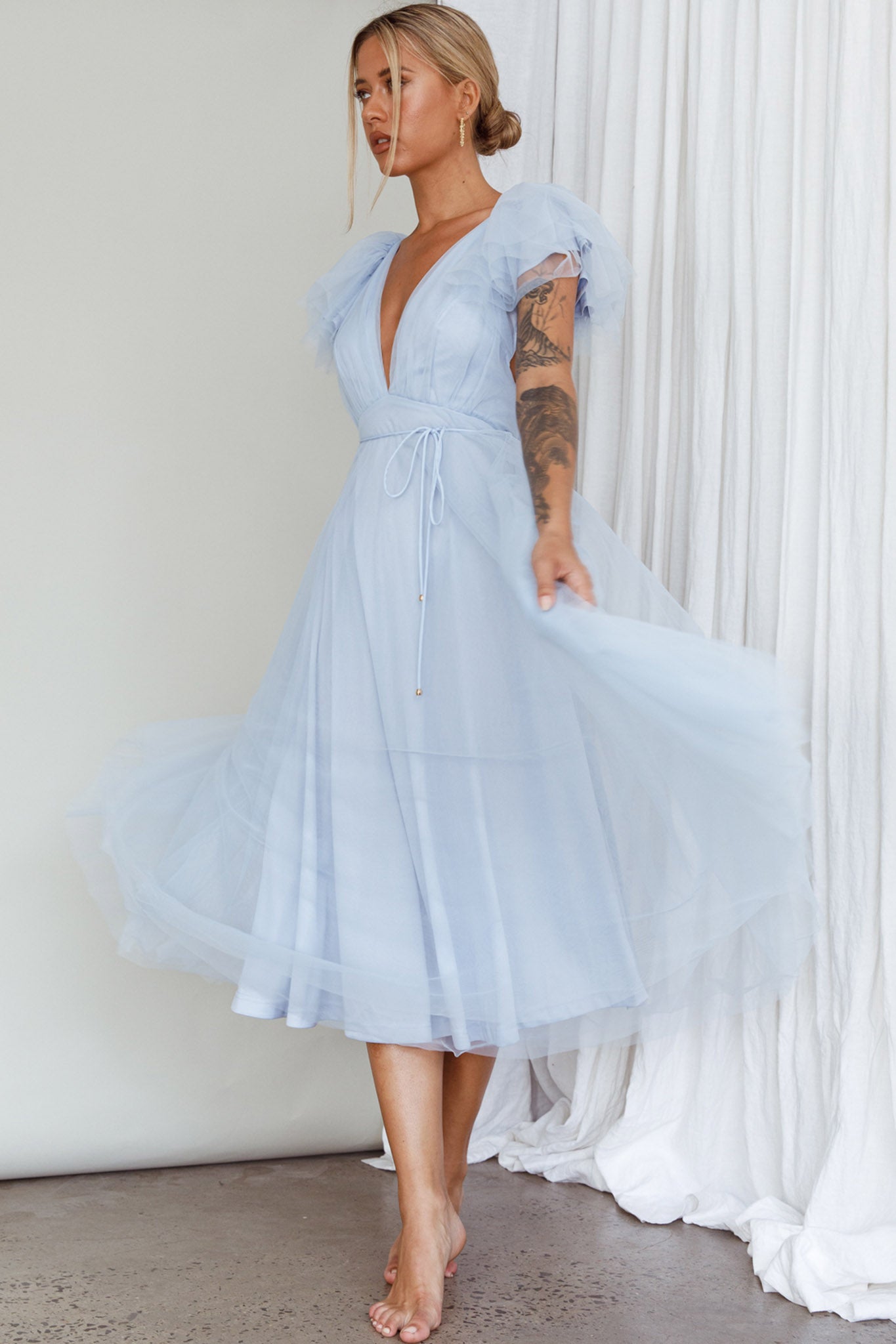 Leap Of Faith Frill Shoulder Tulle Midi Dress Blue