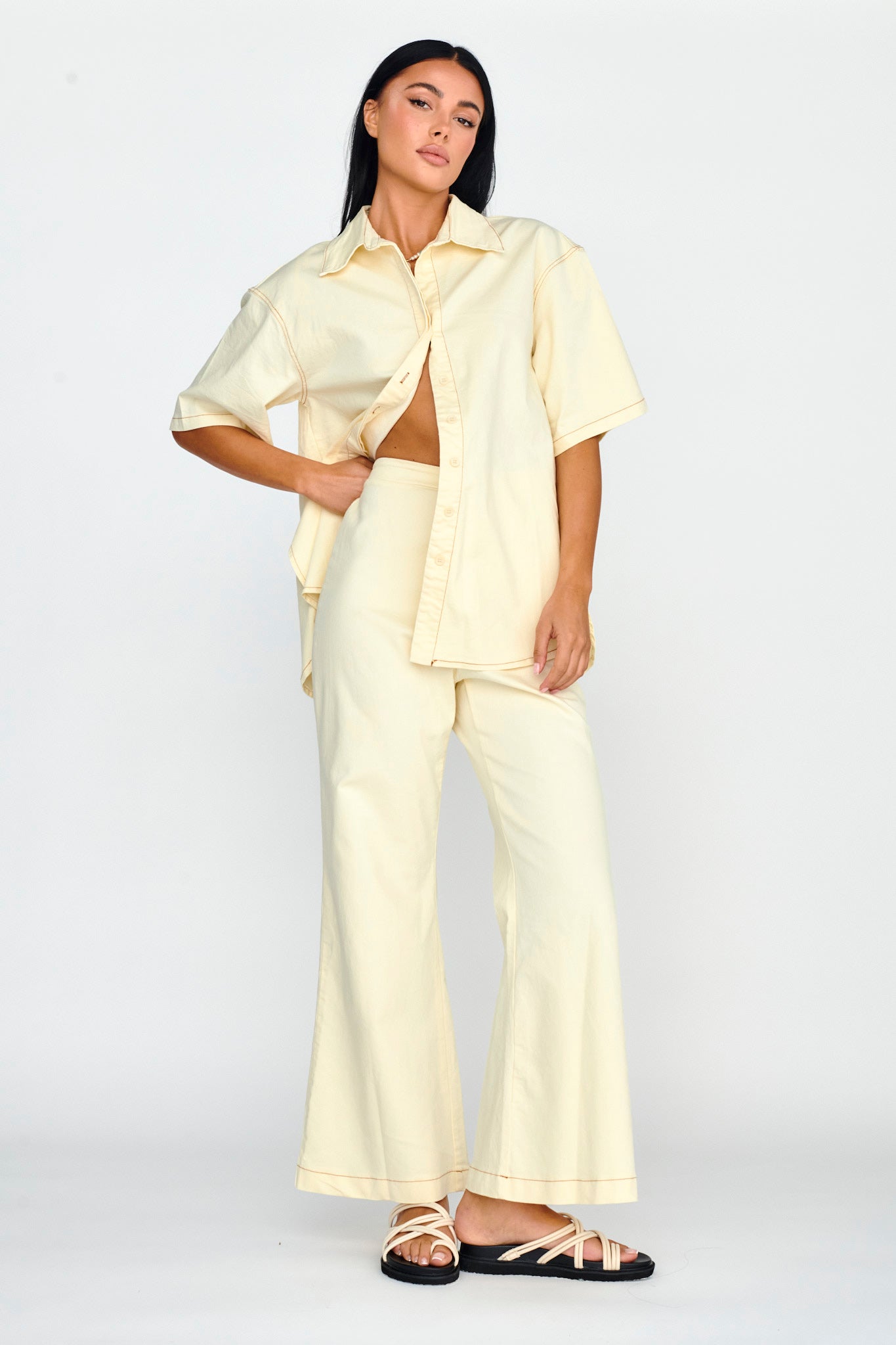 Breeze through your weekend in our chic Light Aura pants. We are in love with their soft fabric and wide-leg fit! Whether it's brunch with your girls or running errands, these pants have you covered. Team them with their matching top and sandals for a sophisticated look.