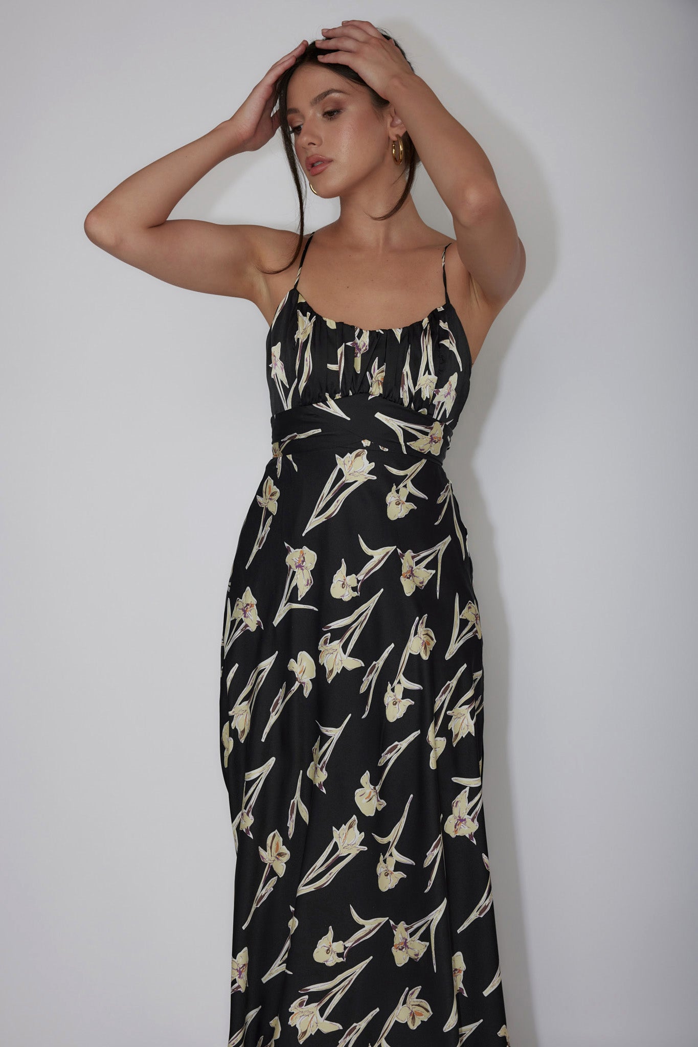 Turn heads in our super chic Linka midi dress. Featuring gathering detail in the bust and a pretty orchid print, we're in love! Perfect for a wedding or special anniversary dinner. Team it with strappy, black heels and a clutch for a look we are loving.