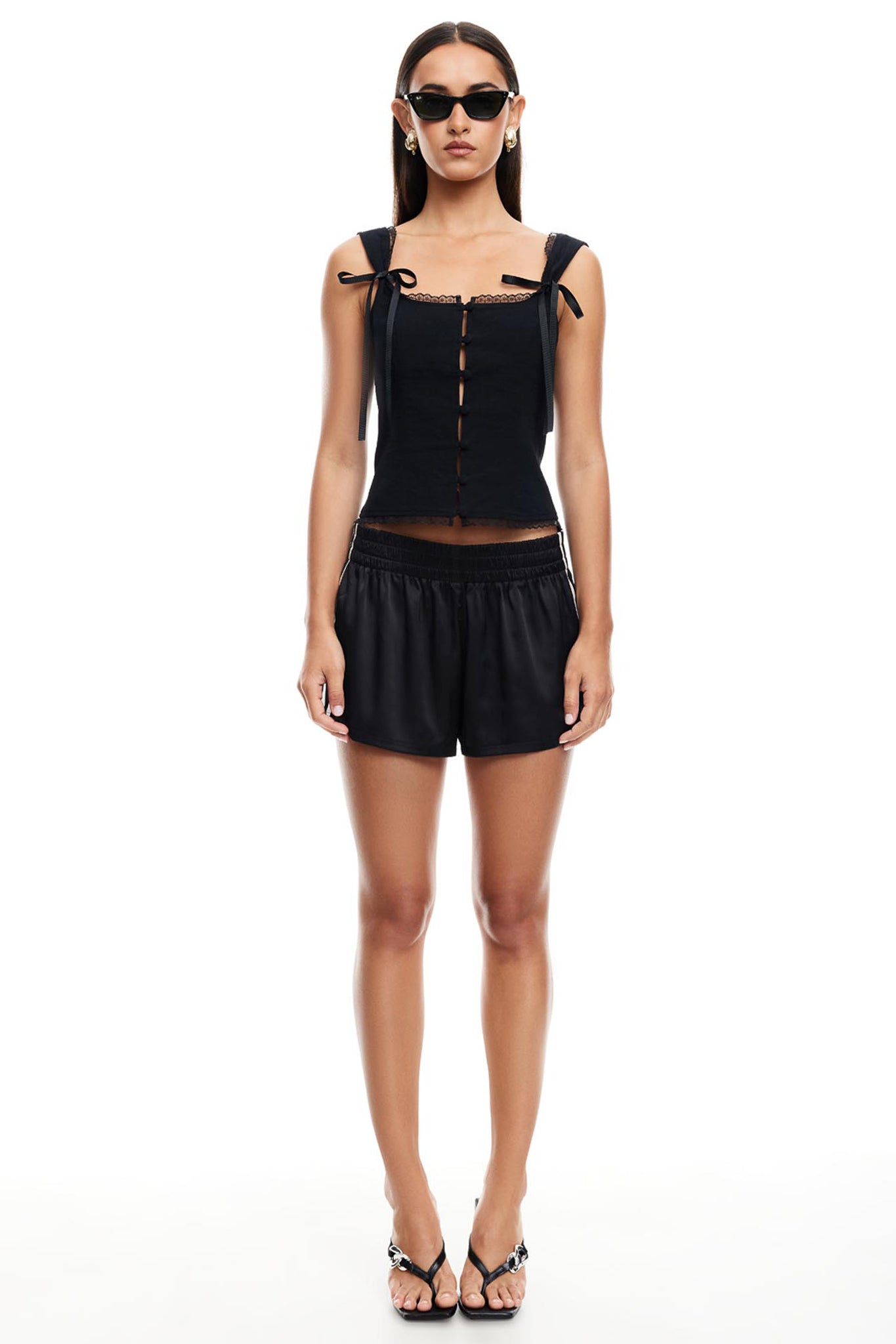 Indulge in the allure of LIONESS' Crystal cami top. Designed to exude contemporary chic and sophistication, this top combines delicate lace trims with charming bow accents for a timeless yet fashion-forward look. Pair it with your favorite jeans for a casual daytime look, or layer it under a blazer for a sophisticated ensemble.