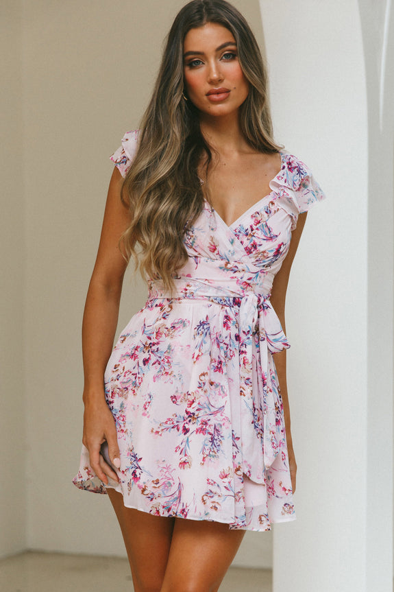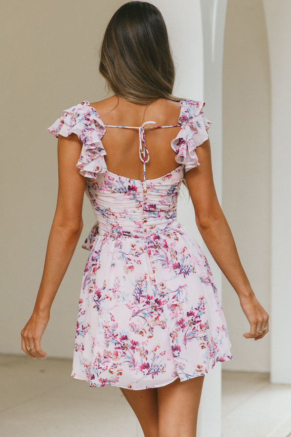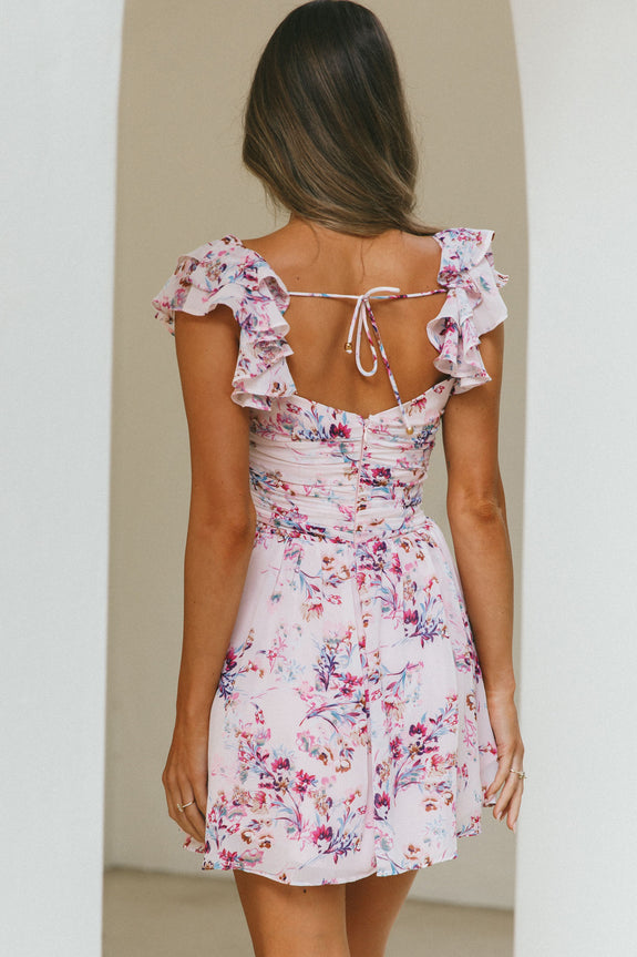 Lola Ruffle Shoulder Ruched Dress Floral Print Pink