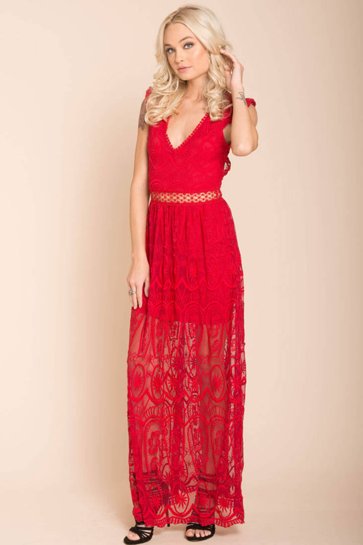 Bohemian Glamour. Capture the essence of the roaring 20s with this lacy, maxi dress with high slits and gorgeous open back.