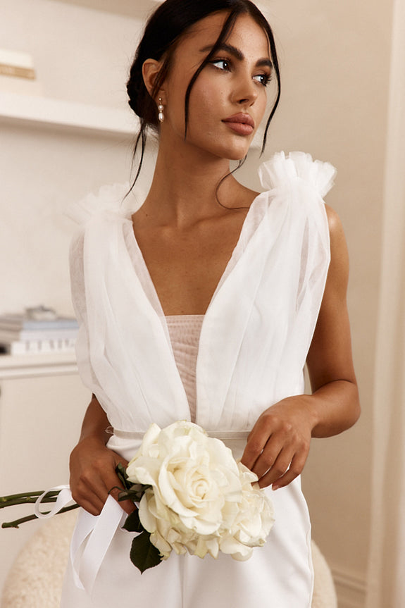 Turn heads in our chic Lovinia jumpsuit. We are in love with its mesh bodice feature and shoulder accents. It's perfect for bridal events or a glam girls night out. Team it with strappy, white heels and a clutch for a look we are loving.