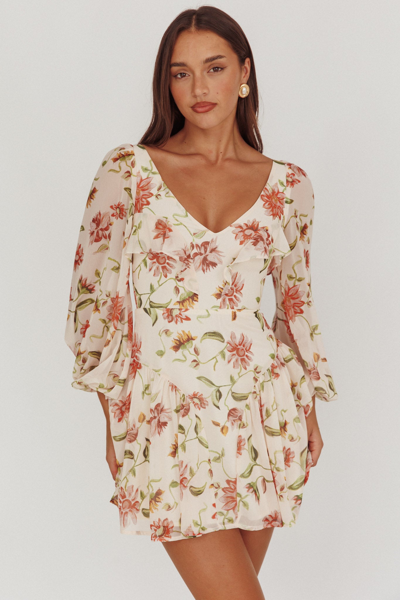 Lucky One Balloon Sleeve Mini Dress Floral Beige