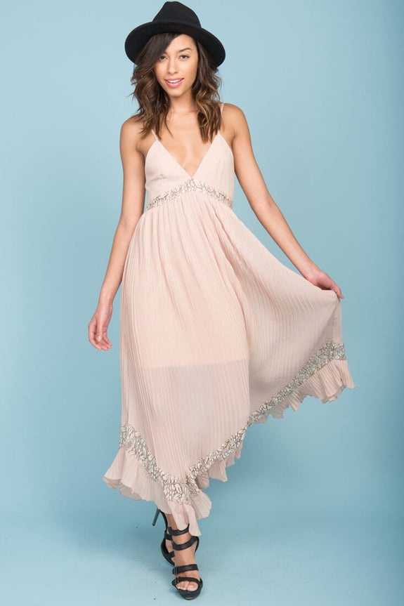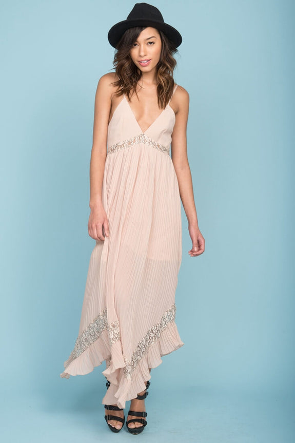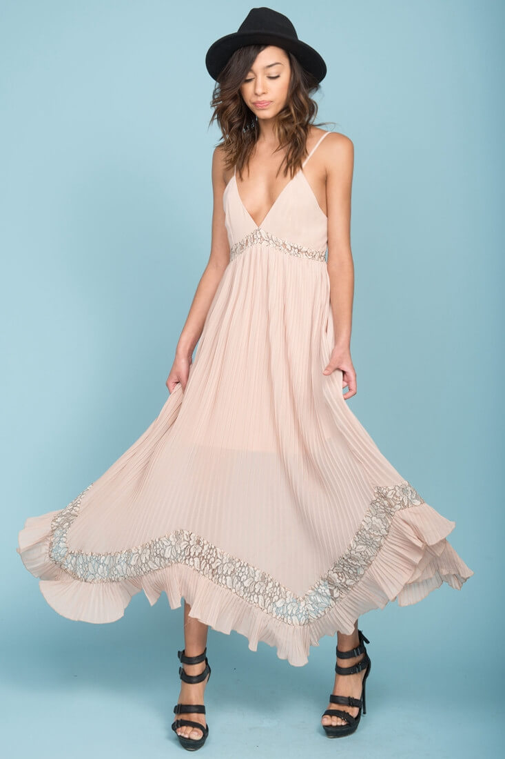 Every girl needs a princess dress and this one could very well be yours. Floral cutouts underneath the bust and hemline are a breezy addition to this feminine frock. Pair with high heeled golden sandals.