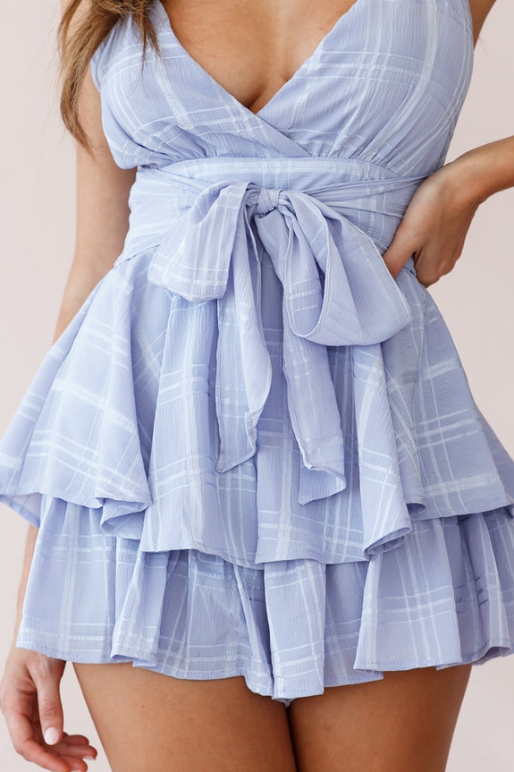 Step into summer with this thin strapped sweetheart dressy romper with tied belt at the waistline.