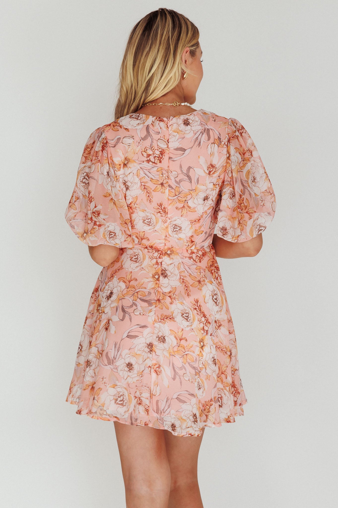 - Orange, floral mini dress