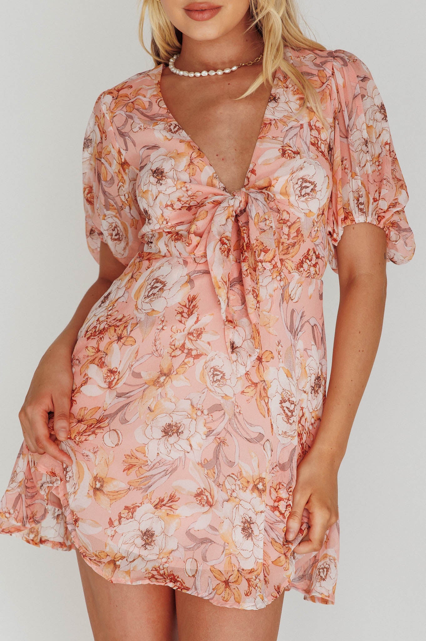 Madison Bow Tie Bust Puff Sleeve Dress Flowers Orange
