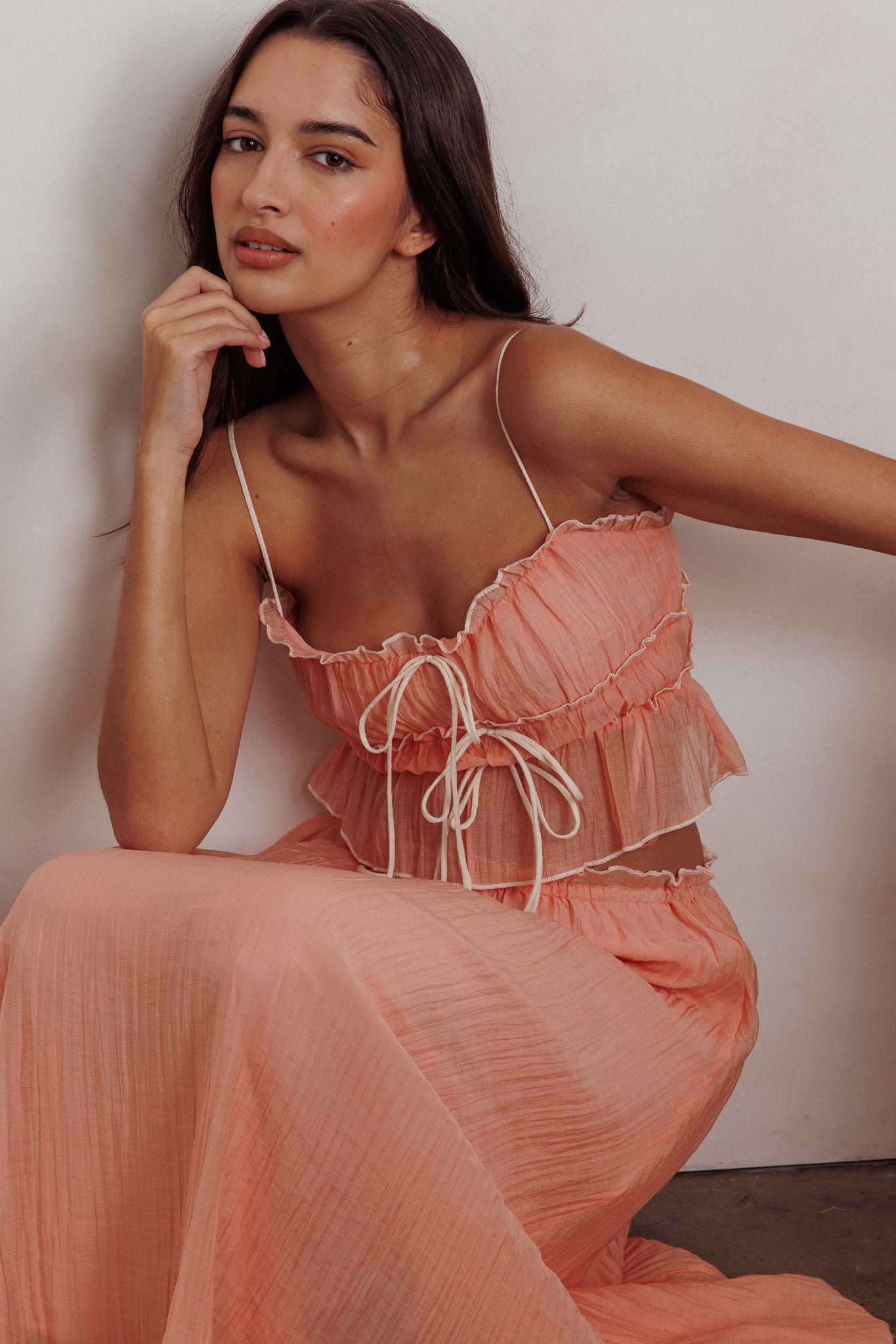 Hello, sunshine! You will steal the show in our super cute Maidens top. Featuring contrasting overlock stitching and tie details. It's perfect for weekend brunch with your besties teamed with sandals and its matching skirt for a dreamy look!