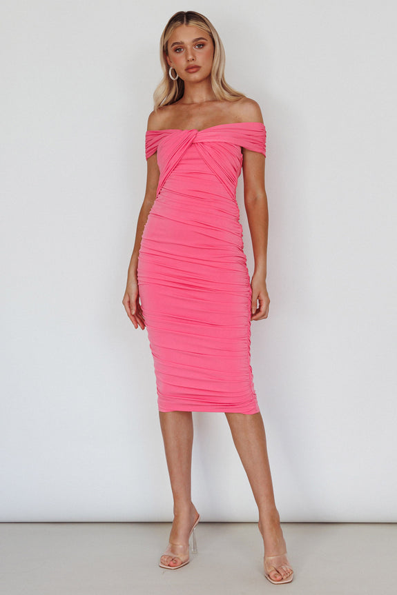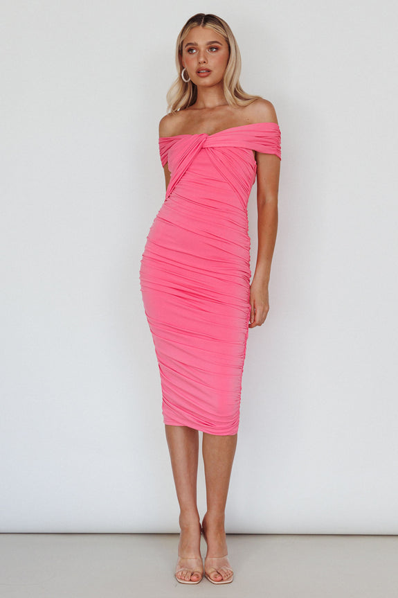 Steal the show in our stunning Maja midi dress. Featuring ruching throughout and off-shoulder sleeves, it's perfect for a wedding or birthday celebration! Team it with diamante mules and a clutch for an unforgettable look.