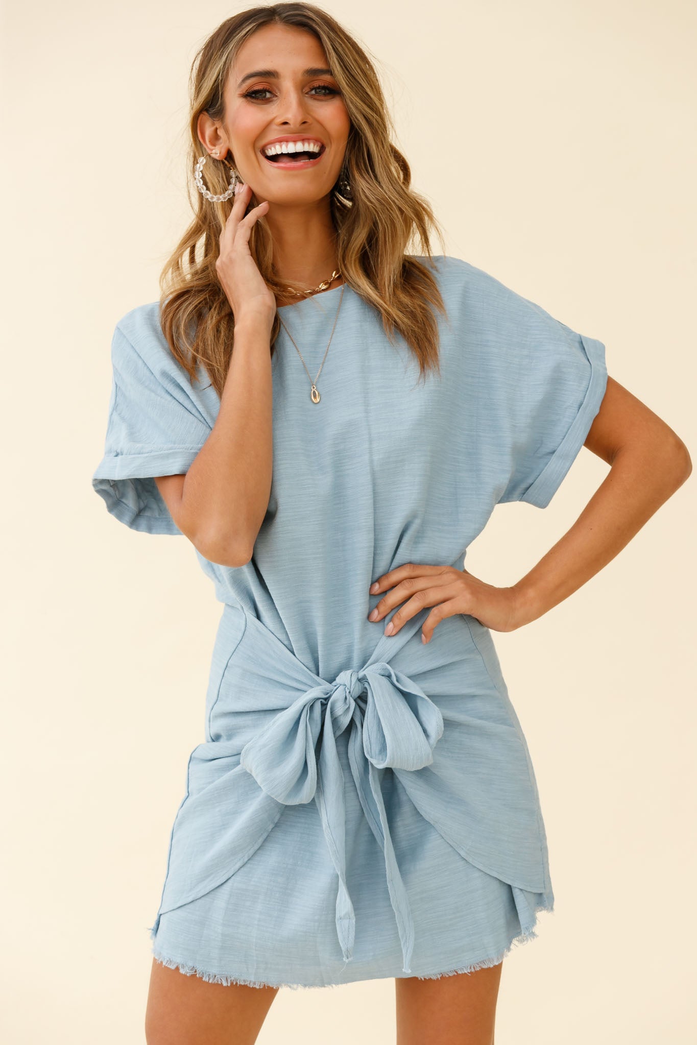 We are loving this breezy, playful shirt dress. Perfect for mall days or dressed up for a lunch date. Featuring a chic, loose fit and tie feature in the skirt. Team it with western boots and a tote for a hot look we can't get enough of.