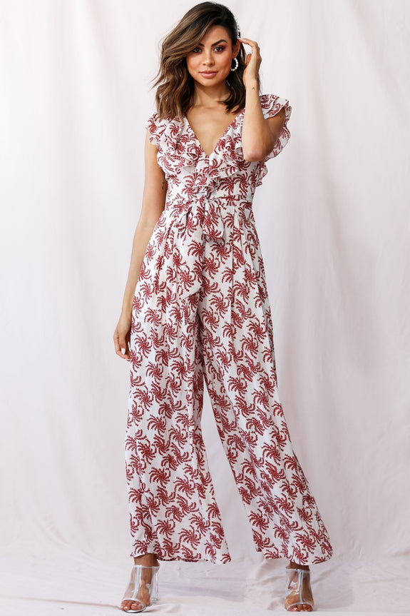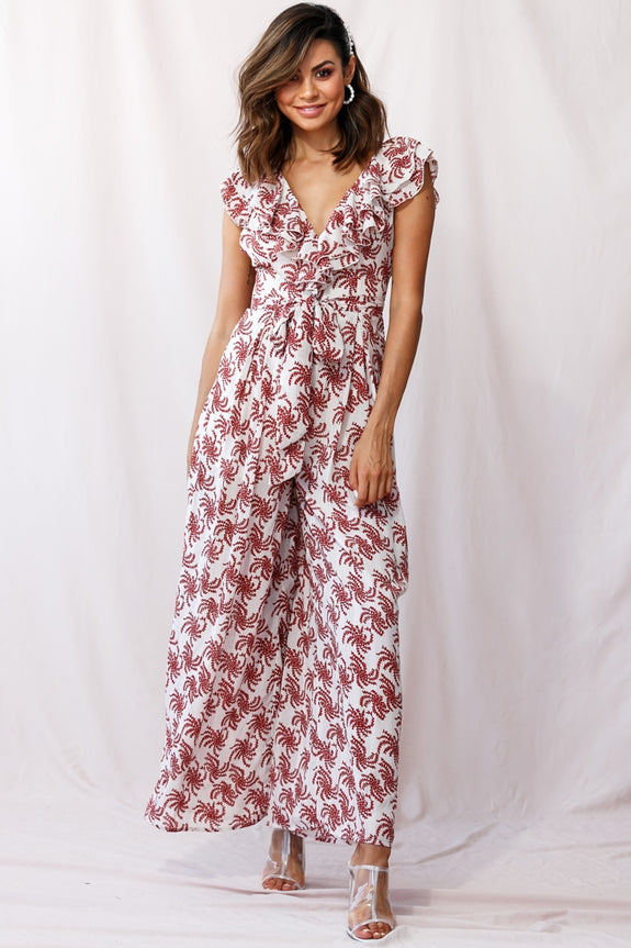 Every girl needs a go-to jumpsuit you can throw on without too much thought and still look super cute and chic. The Marcia is your answer. Partially lined and featuring a super cute print fabric, we're loving the V-neckline with the sweetest ruffle trim that becomes the straps, waist tie and on-trend wide leg cut. Perfect for a daytime BBQ with your friends, teamed with some simple canvas wedges or dress it down with some strappy sandals and a fedora.