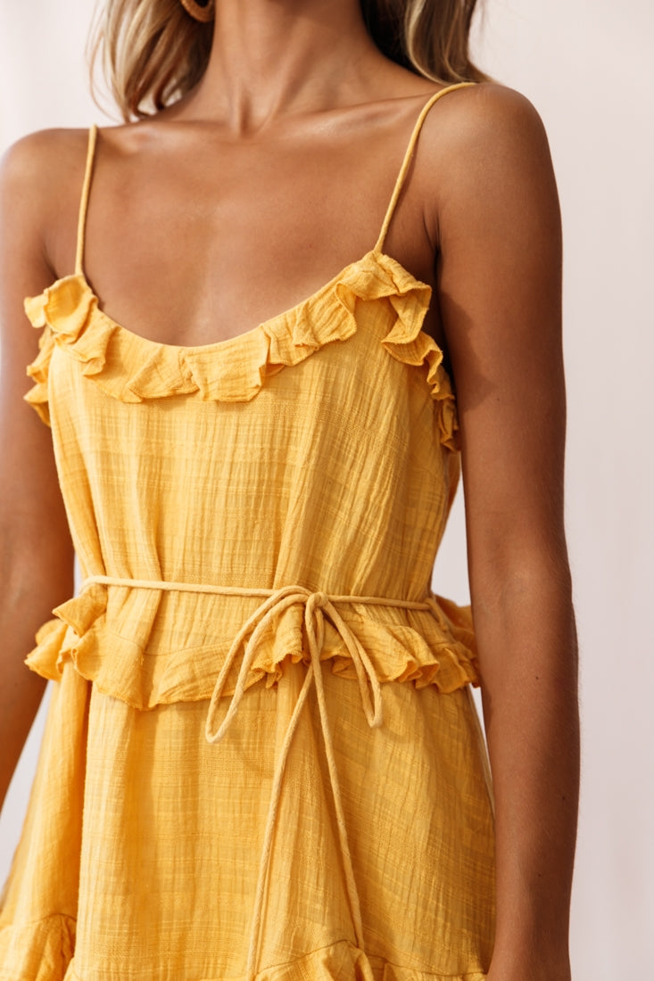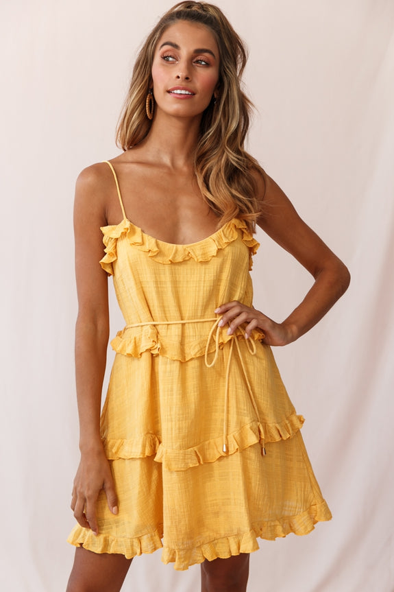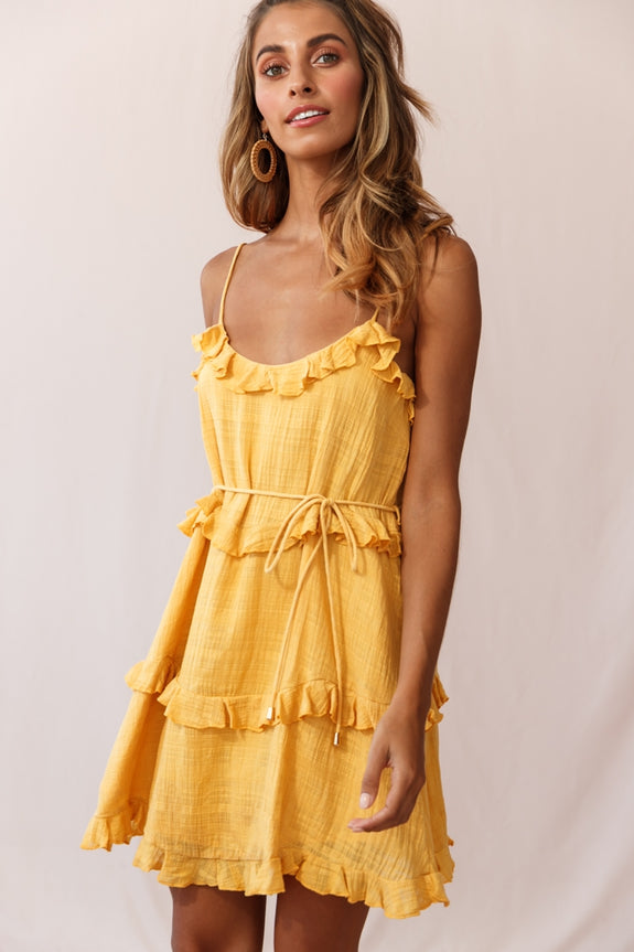 You're a real cutie in our Maria dress. Featuring the sweetest layered frill trim detailing, spaghetti straps and separate string tie around the waist. Wear it to the mall with your girls or to work teamed with tie-up wedges and layered gold necklaces. Cute!