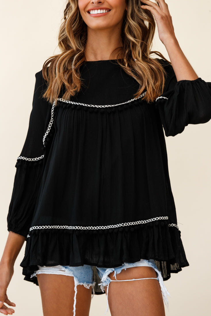 Breeze through your day in our boho-chic Marionette top. Featuring three-quarter sleeves, ruffle hem, pretty embroidery and pom-pom trim detailing. Perfect for lunch dates with your girls layered over skinny jeans and paired with ankle boots and a felt hat.
