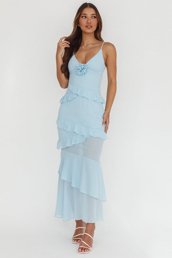 Make an entrance in our gorgeous Marlie maxi dress. It features a stunning layered frill trim and the sweetest detachable rosette. It's perfect for a wedding or special occasion, teamed with silver heels and a satin clutch. This is sure to leave you flooded with compliments.