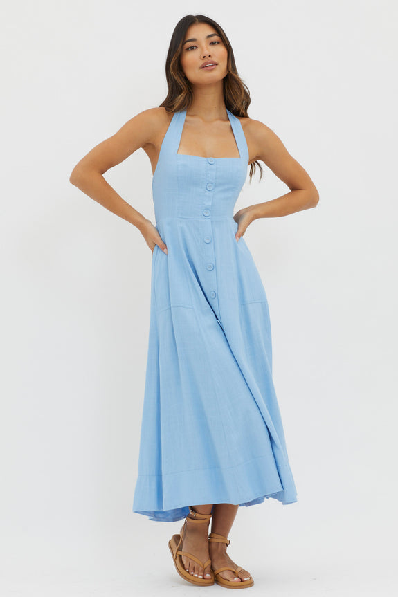Float through your Summer in our gorgeous Marybeth midi dress. Featuring a faux-placket front and halter neckline, it's perfect for sunset happy hour with your girls. Team it with wedges and a tote for a chic look.
