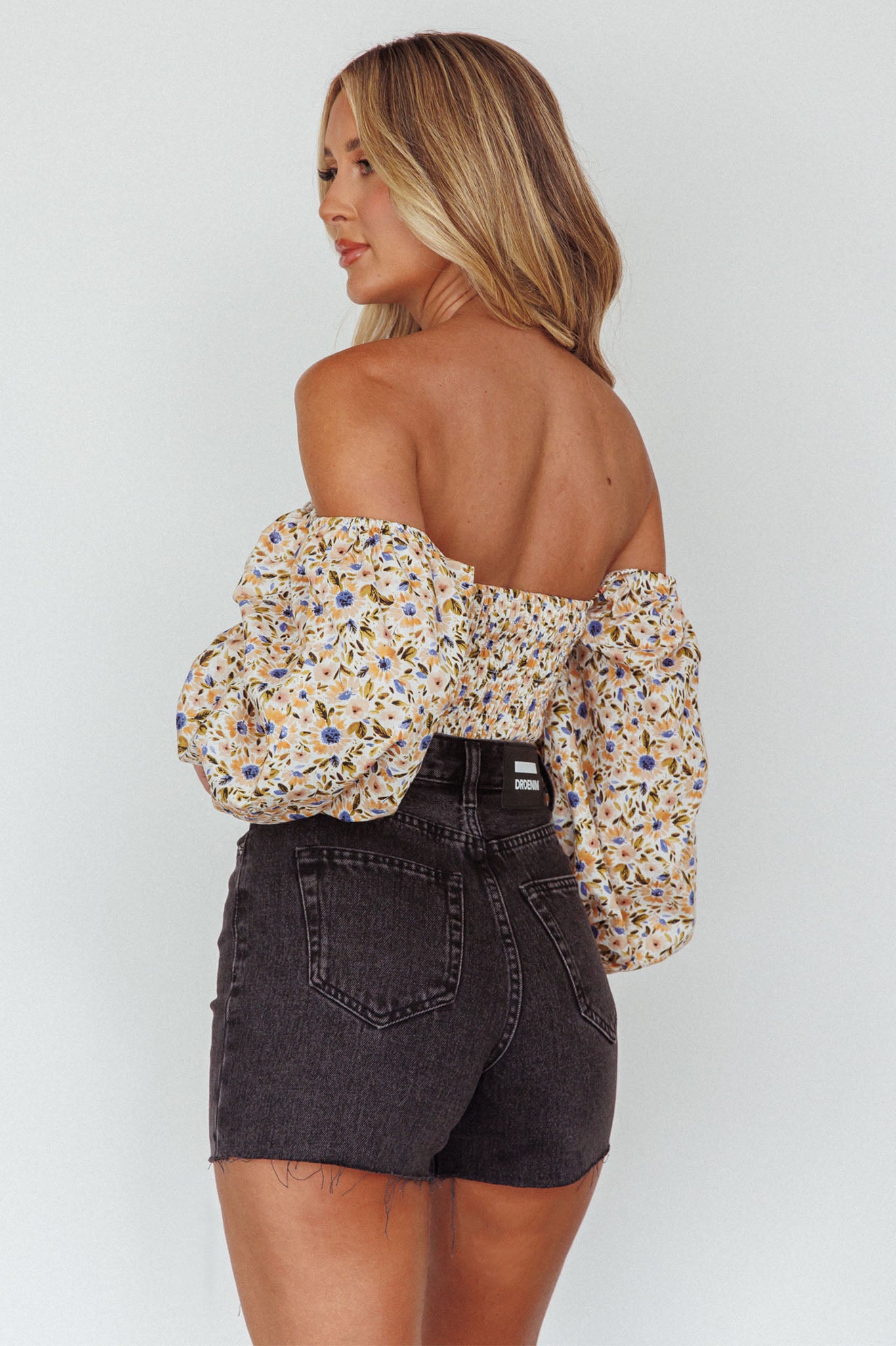 Hello, cutie! You will turn heads in our gorgeous Maureen crop top. Featuring a shirred bodice and off-shoulder style. It's perfect for flirty dates with your lover. Team it with denim shorts and western boots for a look we are loving.