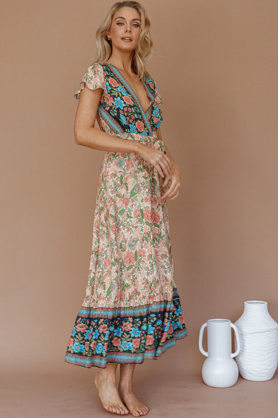 Make a statement in our pretty Mayan midi dress. Featuring fluttery angel sleeves, a wrap-style waist that ties at the side and a fluted hem. We are loving its boho-femme floral print! Perfect for a day strolling the vintage markets teamed with a straw hat and canvas wedges.