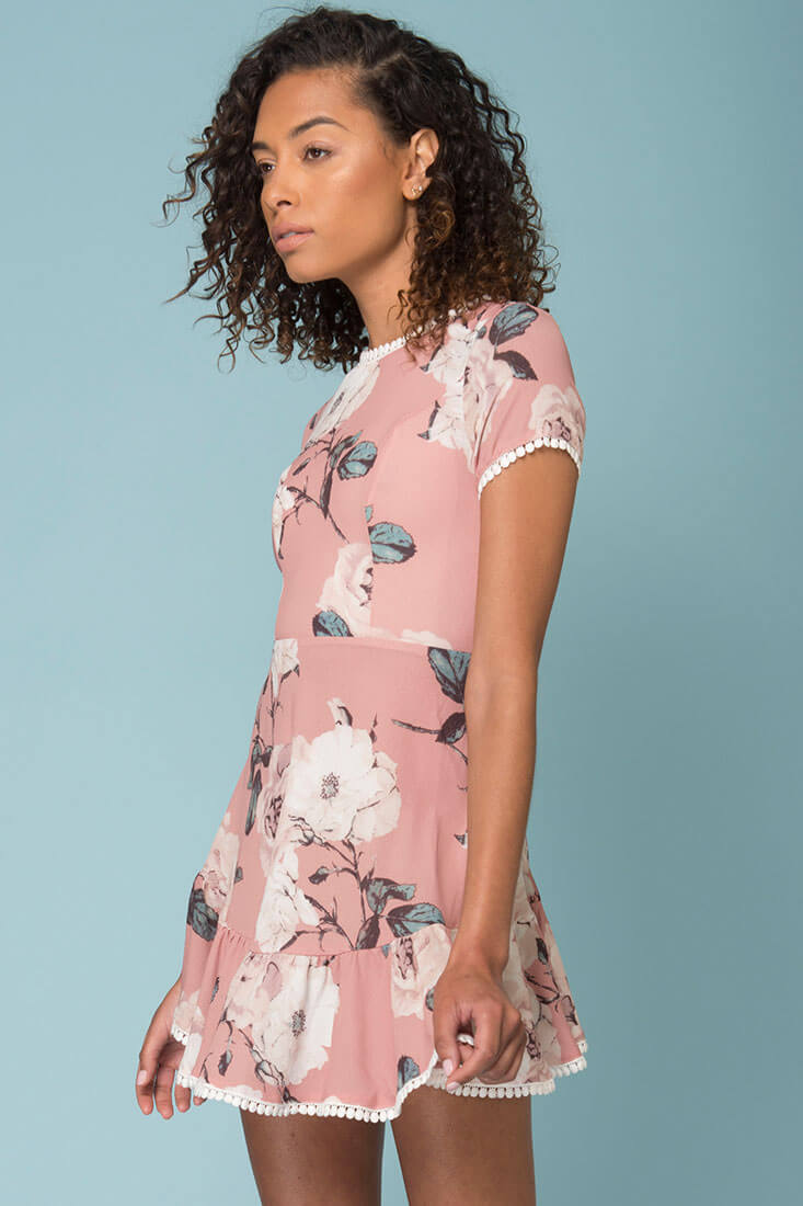 Form fitting pastel-colored mini dress with adorable painted flowers and bulb trimming. Pair with white converse and a cute messenger bag.