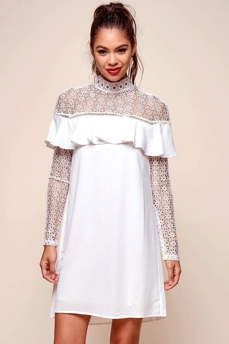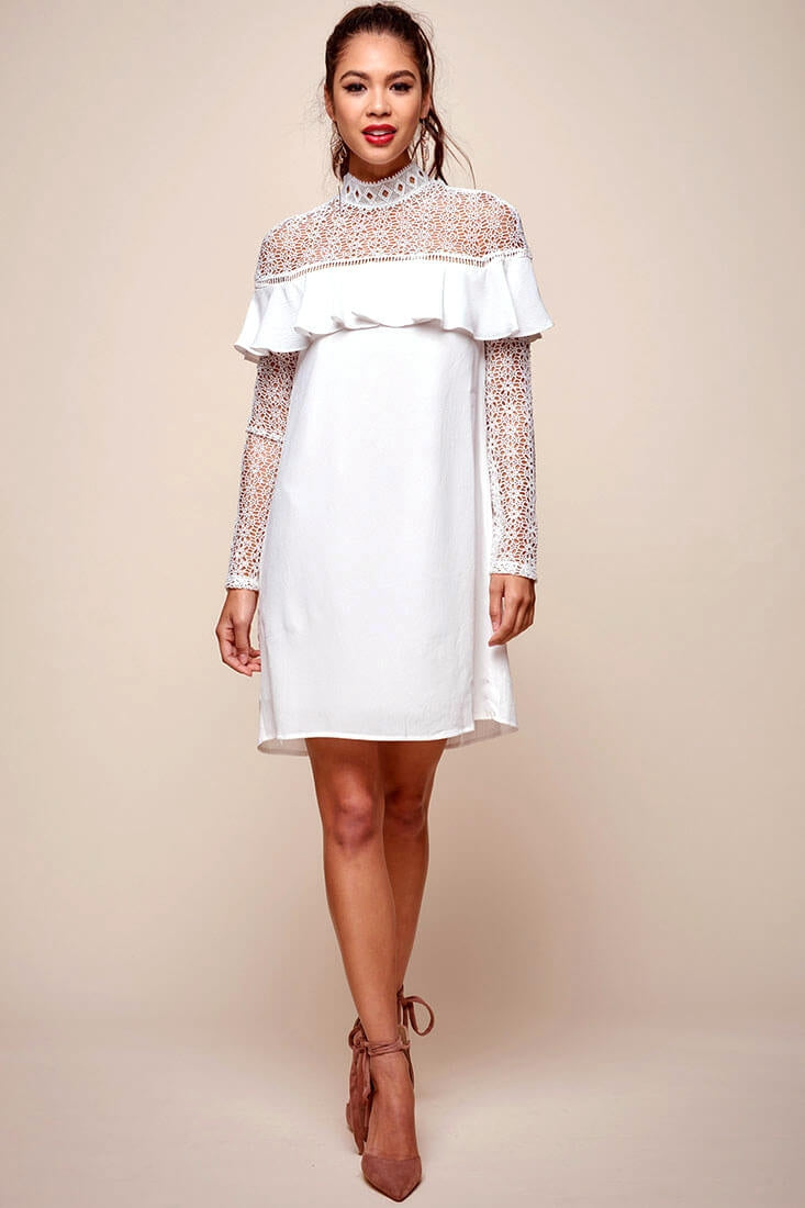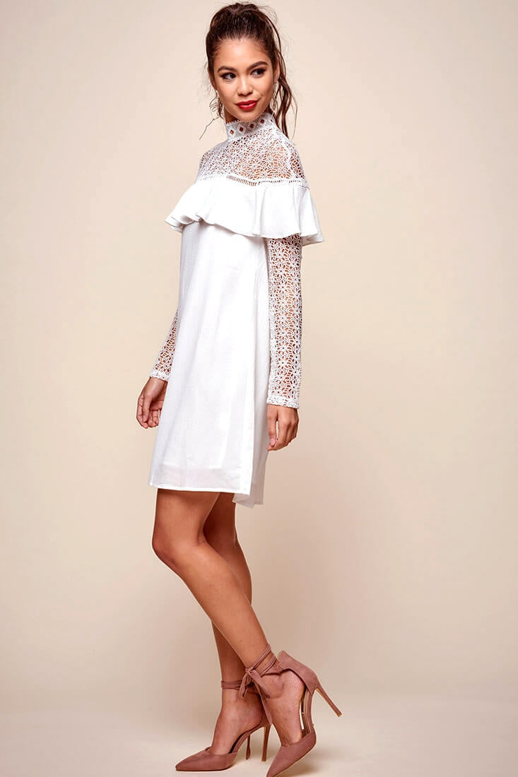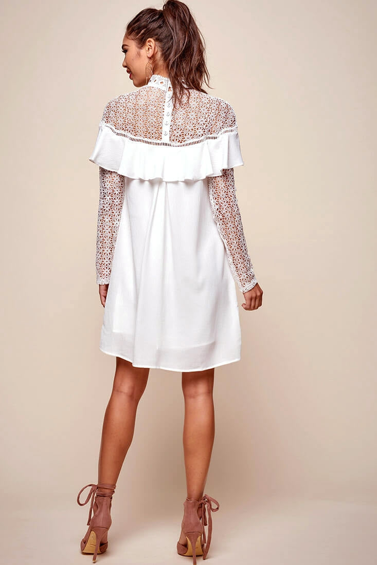 Mendes Lace Detailed High Neck Long Sleeved Dress White