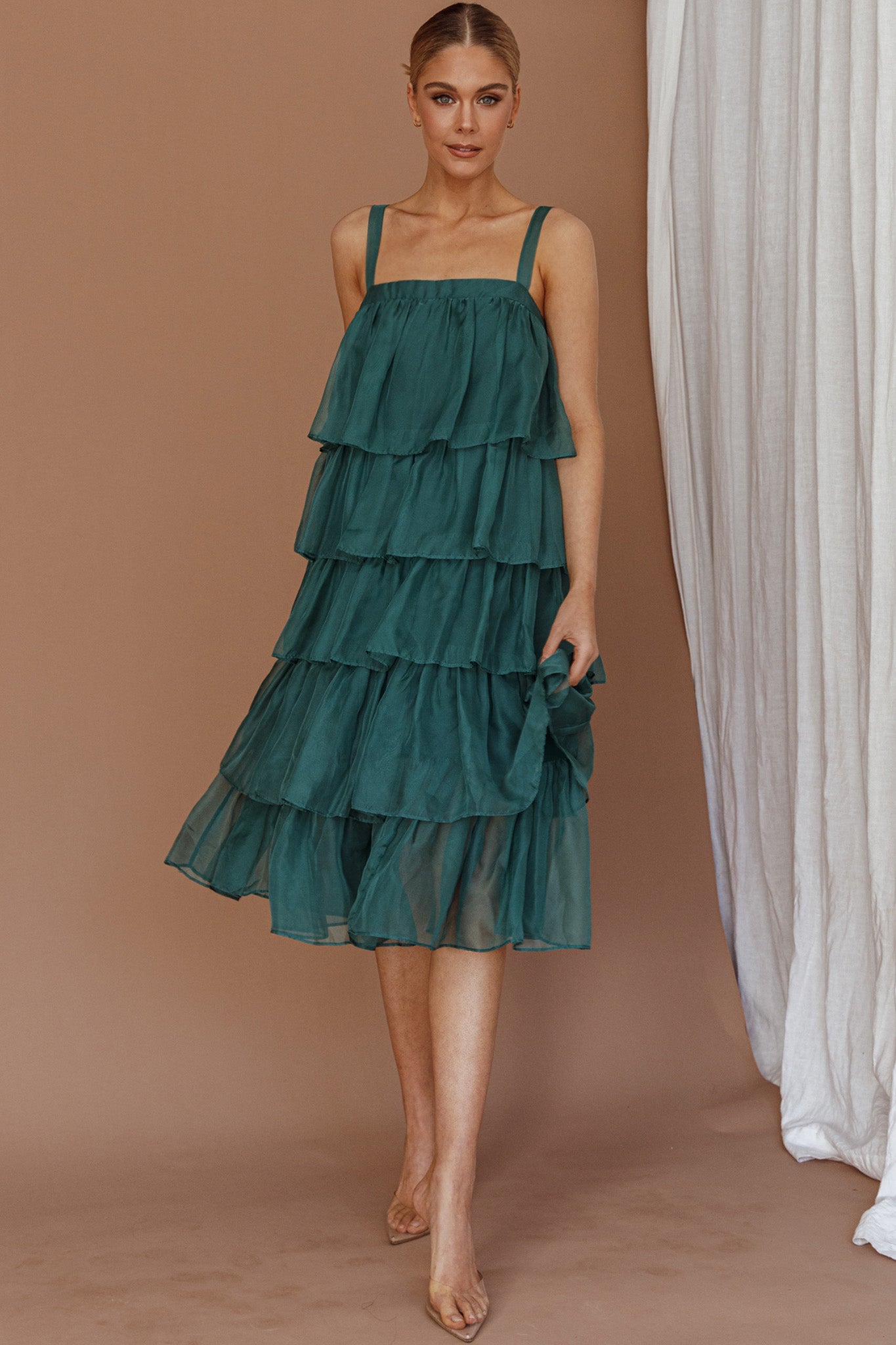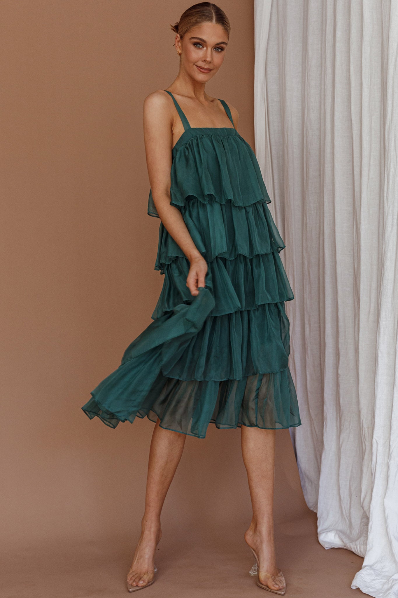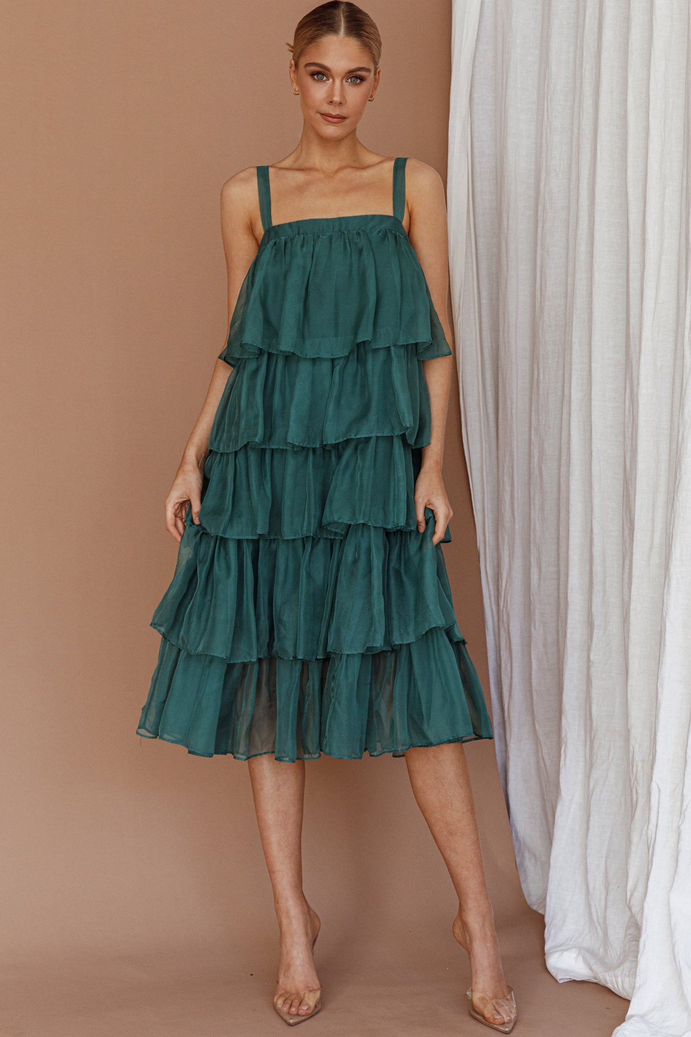 Make an entrance in our gorgeous Merry midi dress. Featuring adjustable straps and tiered, layered frills throughout. It's perfect for Christmas events or a special occasion. Team it with perspex heels and a diamante clutch to complete the look.