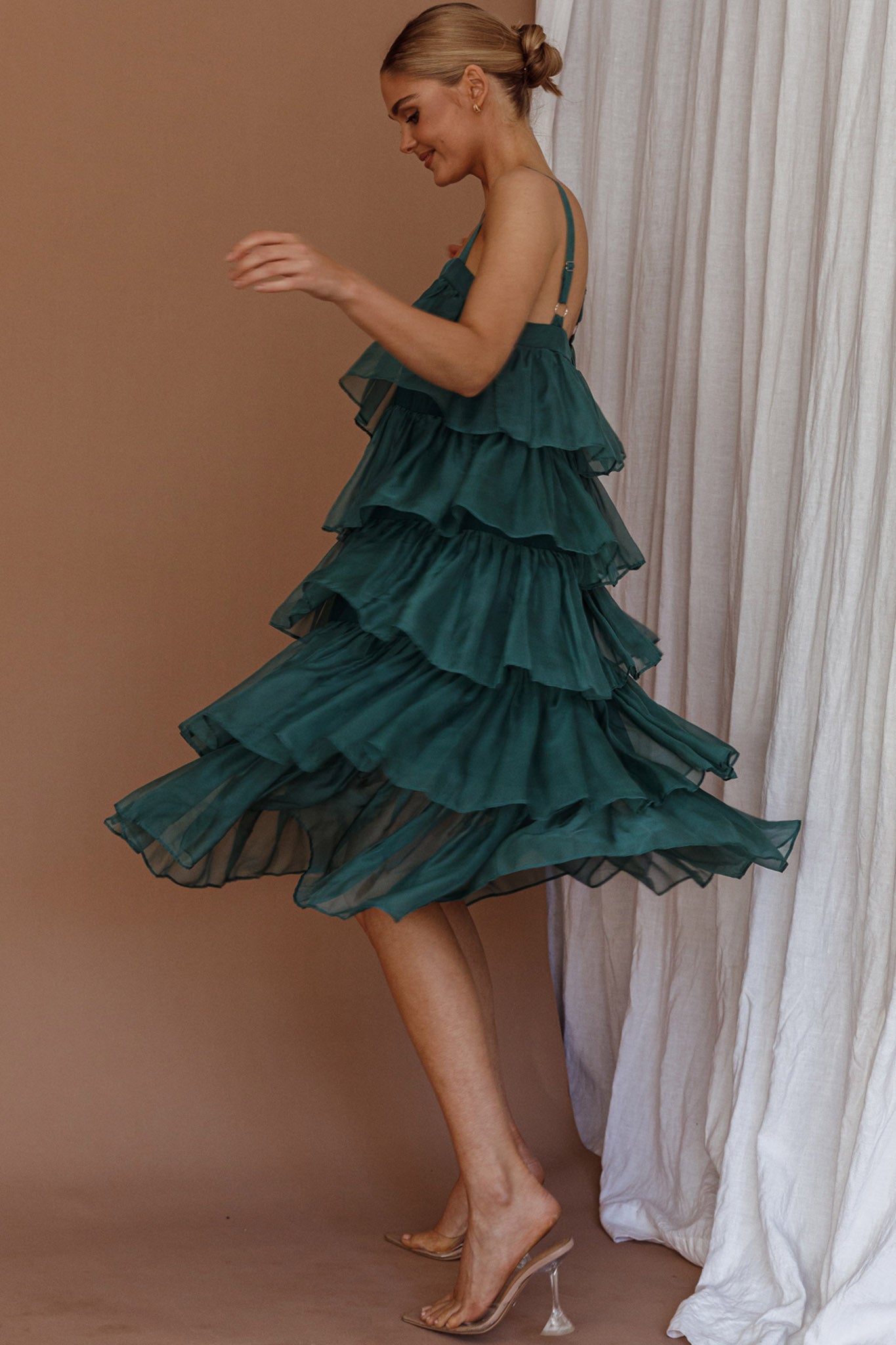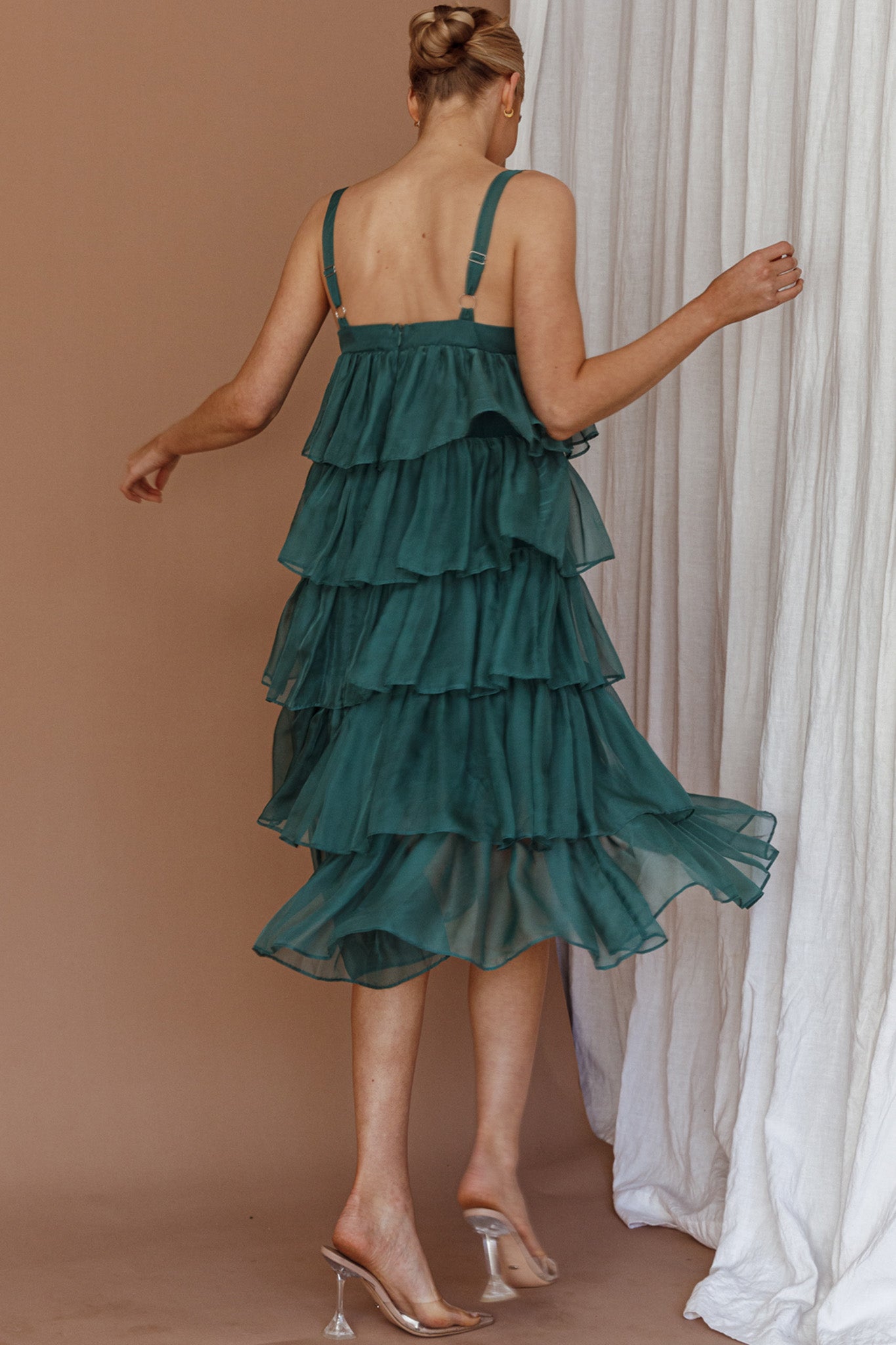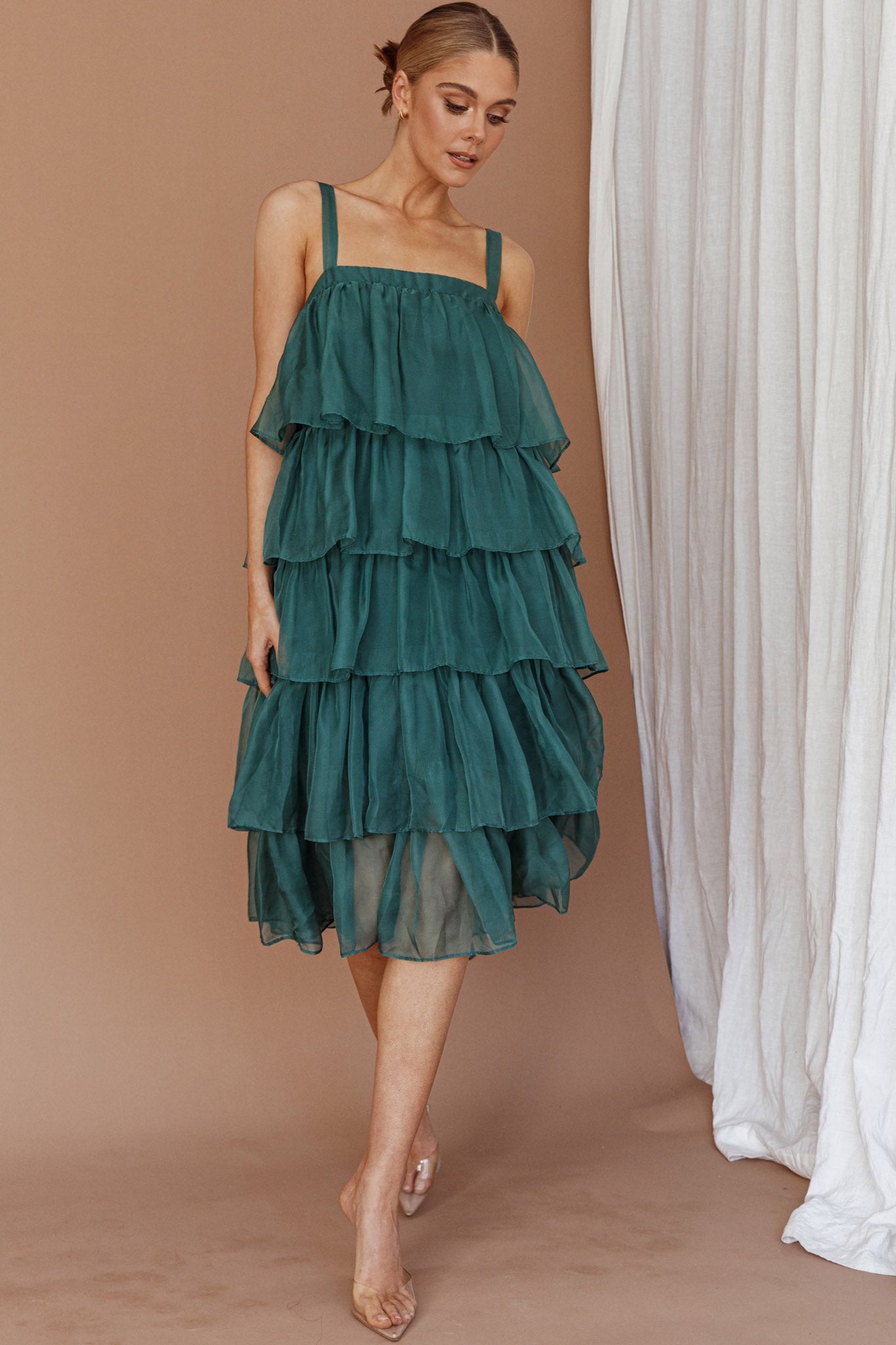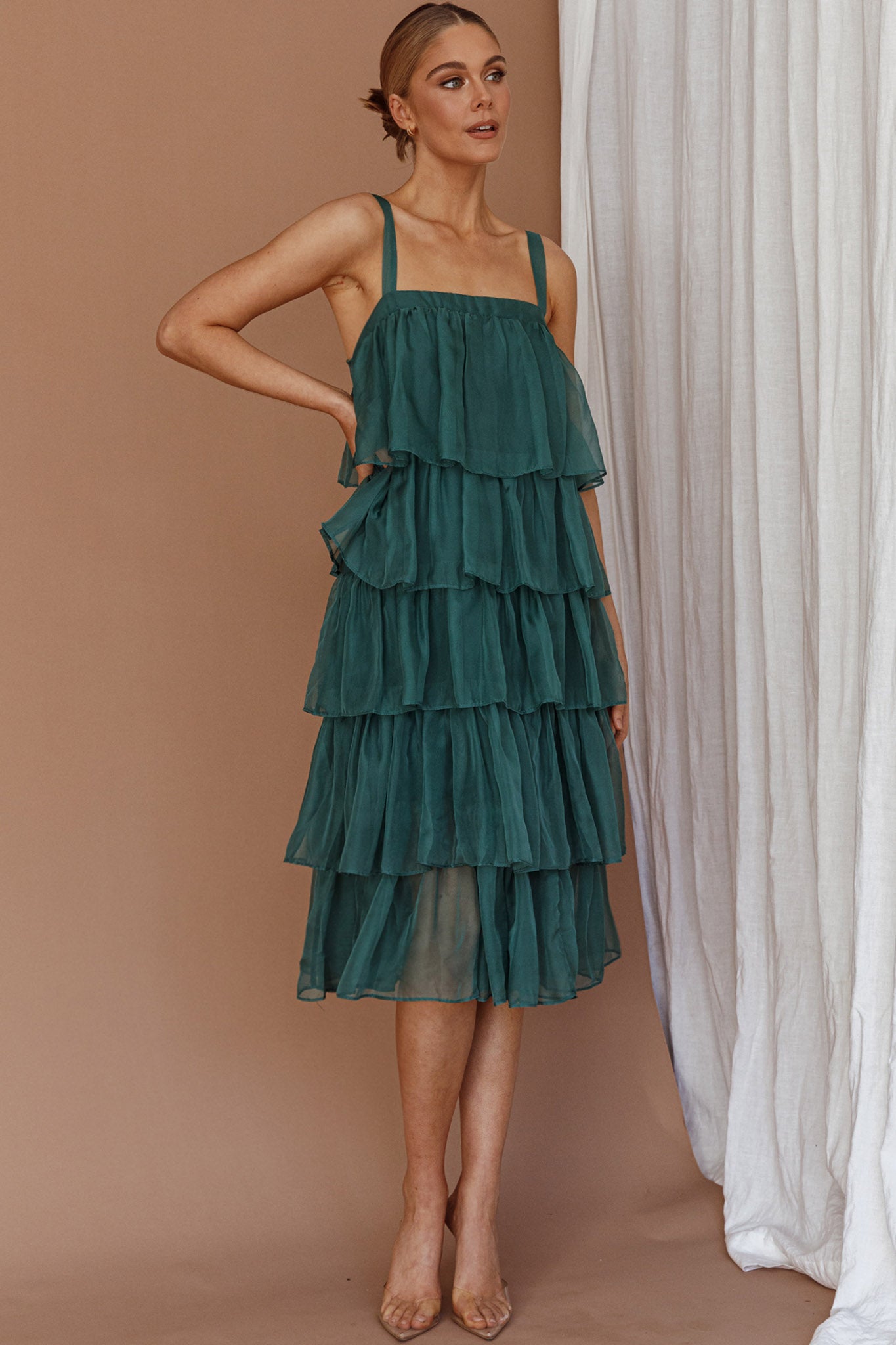 Make an entrance in our gorgeous Merry midi dress. Featuring adjustable straps and tiered, layered frills throughout. It's perfect for Christmas events or a special occasion. Team it with perspex heels and a diamante clutch to complete the look.