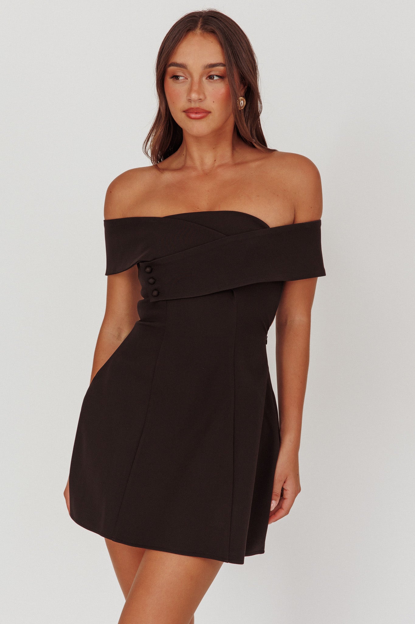 Turn heads in our super cute Midnight Moment mini dress. We are obsessed with its chic off-shoulder design that crosses over in the bust. It's perfect for a flirty first date or birthday dinner with your besties. Team it with pointed-toe kitten heels and a purse for an unforgettable look.