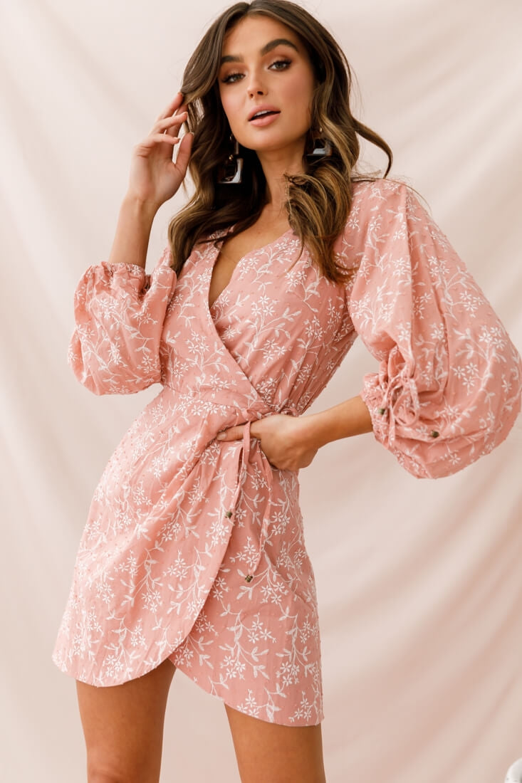 How cute is this dress? Perfect for a day date at the park or brunch with your besties. Featuring long puff sleeves with super cute adjustable gathering detail at the cuff, a surplice neckline and flattering wrap style. We are loving the delicate hail spot fabric with floral embroidery! Team it with some nude sandals or tan ankle boots for a look we are loving!