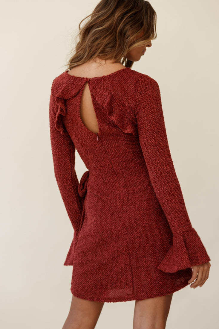 Strut your stuff in our gorgeous Minerva dress. Partially lined, it features a chunky knit fabric, long sleeves with flared cuffs, wrap skirt, and invisible zipper and button closure in the back. Take it from day to night with some pointed toe pumps and gold accent jewelry.